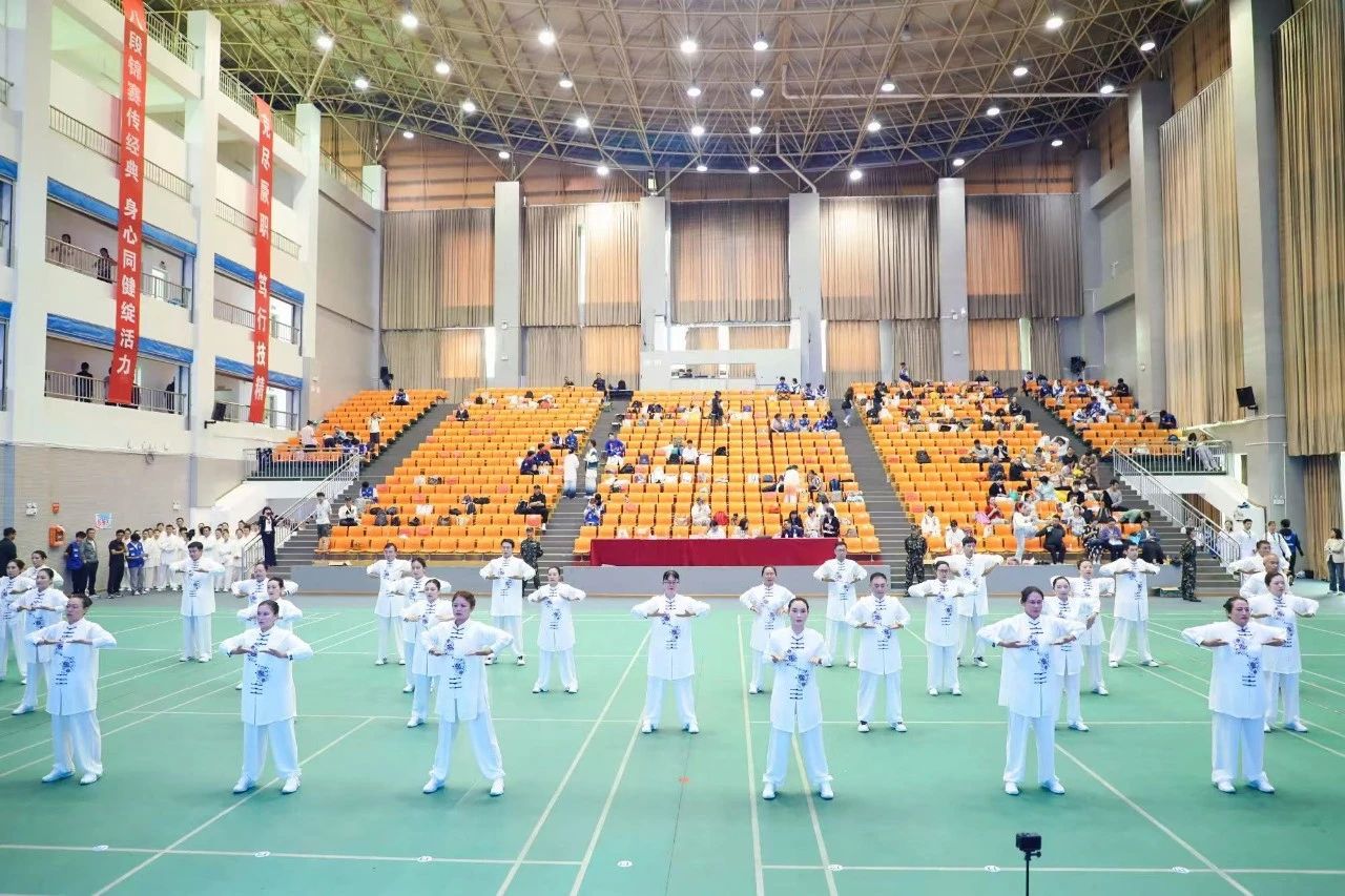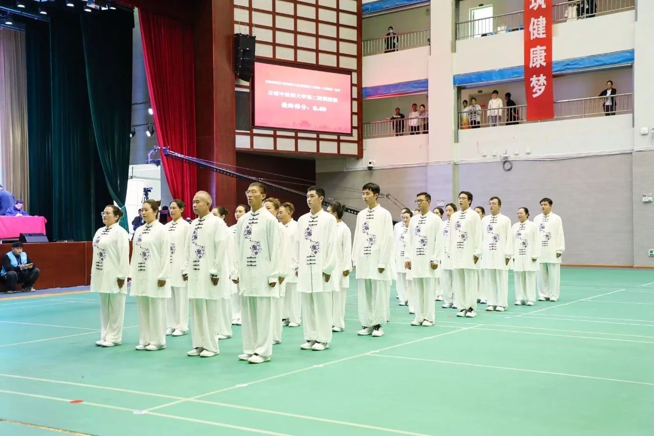 比赛现场气氛热烈,beat365官网代表队作为第12号队伍闪亮登场。队员们身着统一队服,精神饱满,在大家默契的配合下,完整而流畅地演绎了八段锦功法。他们的动作整齐有力,一招一式都充满了韵味,将八段锦“松紧结合”“动静相兼”的特点展现得淋漓尽致,充分体现了传统养生文化的深厚内涵,赢得了现场观众和评委的阵阵掌声。