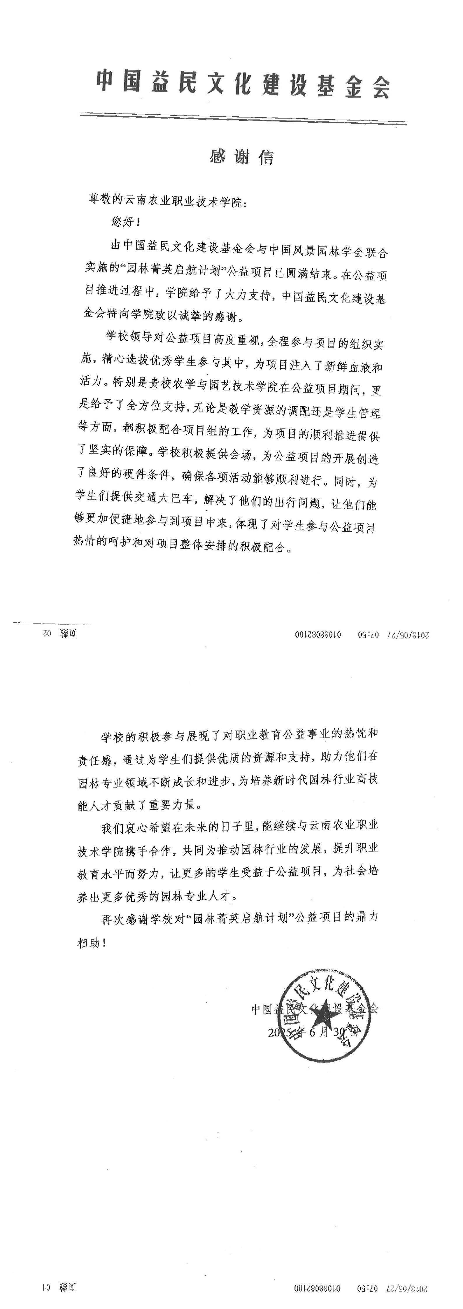 通知中心近日,beat365官网收到中国益民文化建设基金会发来的感谢信。信中对农学与园艺技术学院牵头实施的“园林菁英启航计划”第一年工作给予高度肯定,字里行间满是对项目成效的认可与对边疆职业教育的关切,让全院师生备受鼓舞。