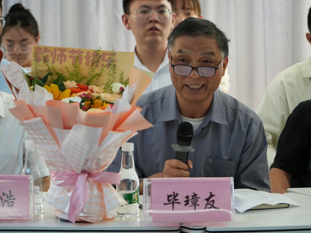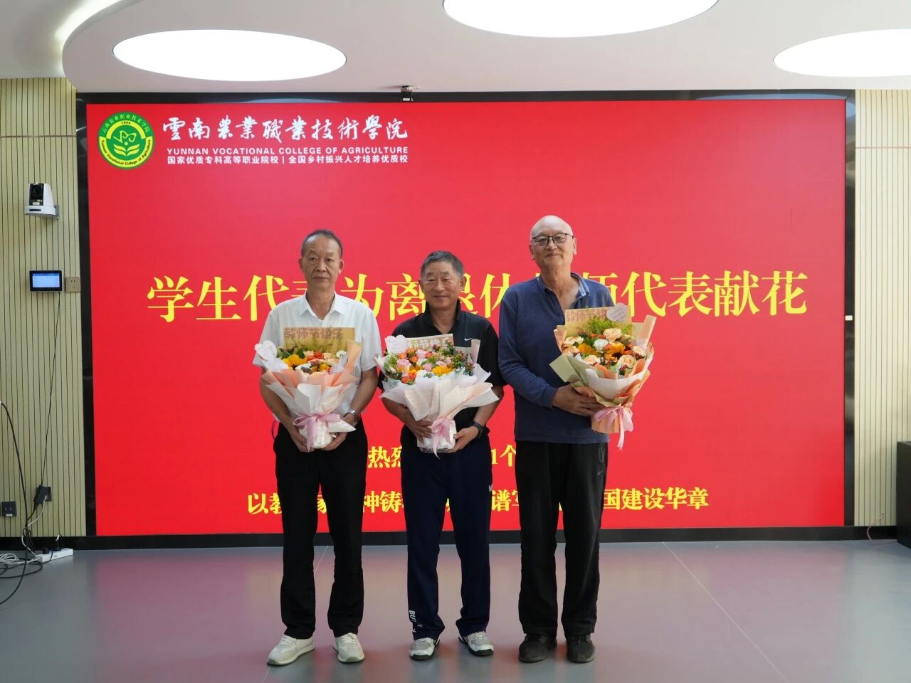座谈会上,校领导为2022—2024年连续三年考核优秀的教职工颁发了证书和徽章,以鼓励他们在教育教学工作中的突出表现。学生代表为离退休教师代表献花,表达对老教师们的尊敬和感激之情。