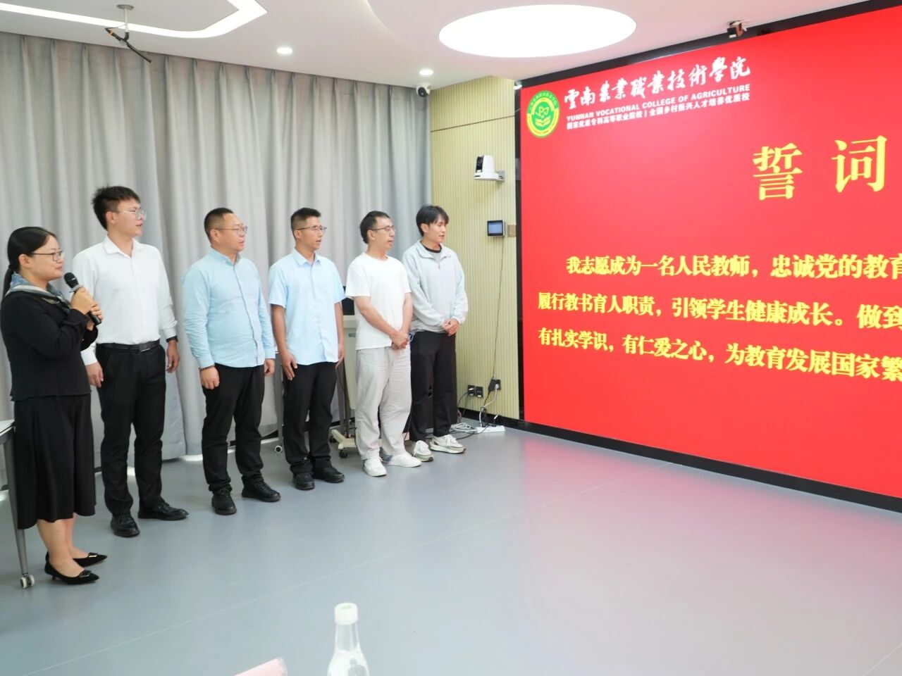 此外,9月新入职的教师们在座谈会上进行了集中宣誓。他们庄严承诺将忠诚于党的教育事业,履行教师的神圣职责,为培养德智体美劳全面发展的社会主义建设者和接班人而努力奋斗。与会教师代表还为新入职教师佩戴了校徽。