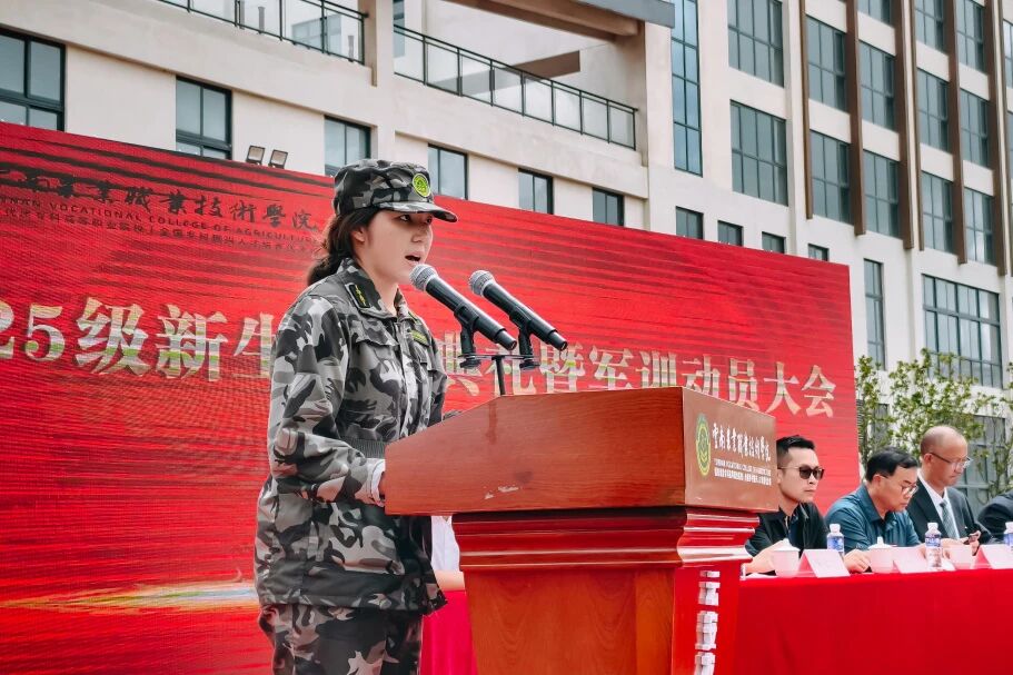 畜牧兽医学院(宠物科技学院)段钰、云安农文旅产业学院王悦瑶作为学生代表发言,她们代表新生郑重承诺,将在军训期间端正态度、团结互助、收获成长,在训练场展现百折不挠、实干笃定的云农院学子风采。