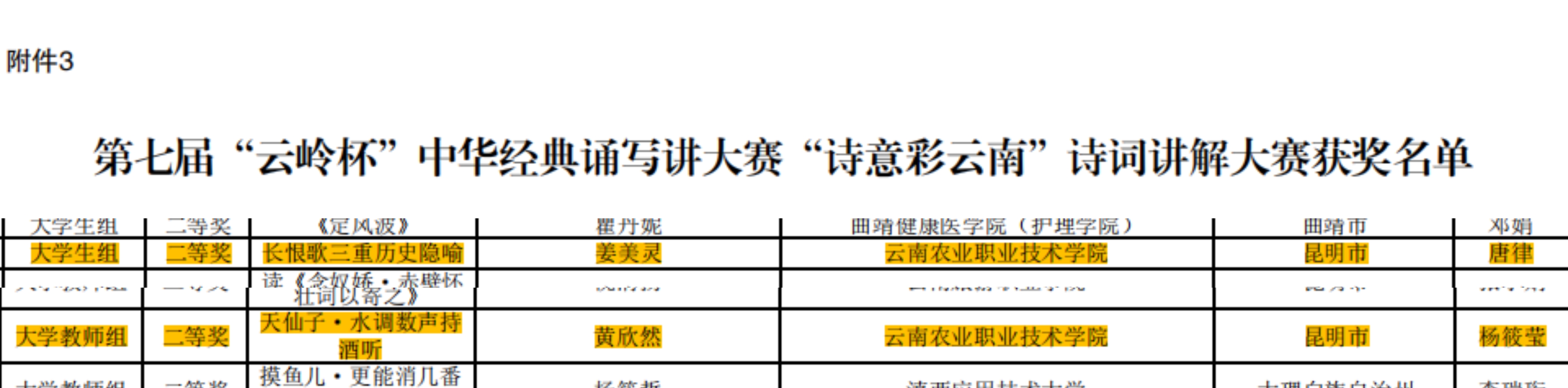 beat365官网黄欣然老师作品《天仙子•水调数声持酒听》、姜美灵同学作品《长恨歌三重历史隐喻》获“诗意彩云南”诗词讲解大赛二等奖;冉鸿雁老师作品《<劝学>节选》、李佳慧同学作品《沁园春•雪》、纪明亚同学作品《<试帖诗稿>节选》、陈馨瑶同学作品《从军行》获“墨香彩云南”书写大赛优秀奖;陈稚琳同学作品《<滇缅公路>节选》获“书香彩云南”经典诵读大赛优秀奖。