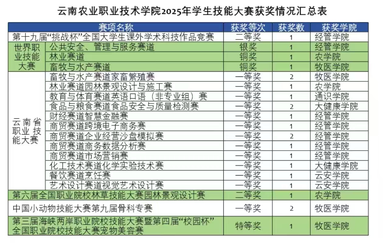 通知中心时至金秋,2025年世界职业院校技能大赛和云南省职业院校技能大赛等比赛相继落幕,beat365官网参赛团队凭借扎实的专业知识、精湛的操作技艺以及默契的团队协作,一路披荆斩棘,斩获多项大奖,充分展示了云农院学子“以技立身、以技赋能”的青春风采,为学校“十四五”的收官工作交上了一份完美答卷。
