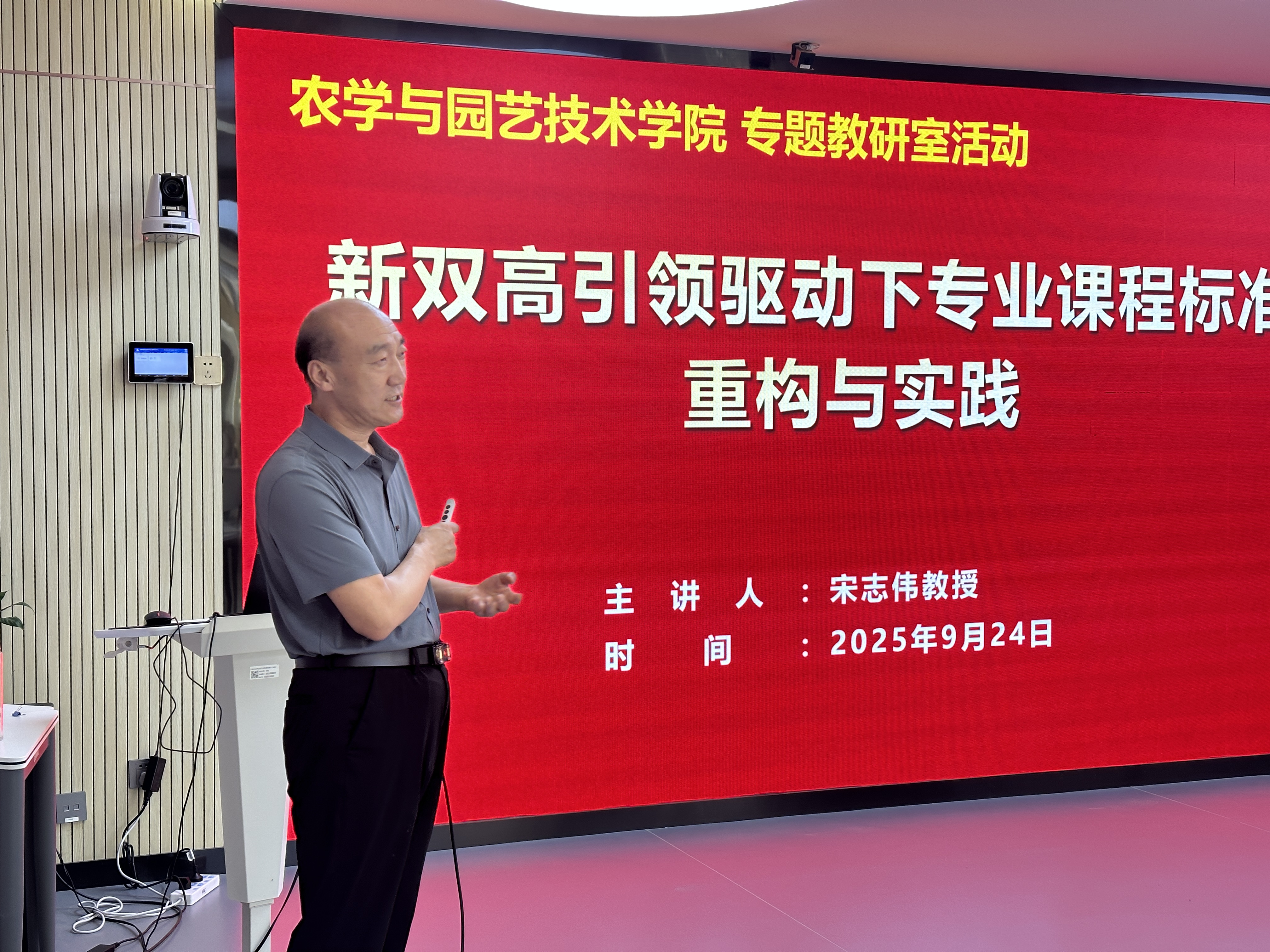 围绕教育部2025年版职业教育(高职专科)专业教学标准,宋教授结合第二期省级“双高计划”现代农业技术专业群建设要求,深入剖析当前学院专业人才培养方案存在的短板,针对性提出修订思路:一是建立校行企协同共制机制,凝聚育人合力;二是创新专业人才培养模式,契合产业发展需求;三是重构凸显特色的课程体系与实践教学体系,强化实践育人;四是开设田间课堂与云农特色产教融合课程,实现教学与生产场景无缝衔接。在重构后凸显产教融合特色的课程标准的制定方面,宋教授强调要对接云南高原特色现代农业对高技能人才的新需求,对接龙头企业核心岗位,精准定位人才培养目标规格,培养“三型”人才;系统梳理头部企业典型生产岗位核心能力,绘制“能力图谱”,将企业生产技术标准、典型生产岗位操作规程纳入课程内容,升级课程标准。并以《植物生长与环境》课程对接云南云秀花卉有限公司等三家企业设施作物水肥一体化技术等产业高端升级课程标准为例,提出校企合作共同编制专业核心课程标准的路径。