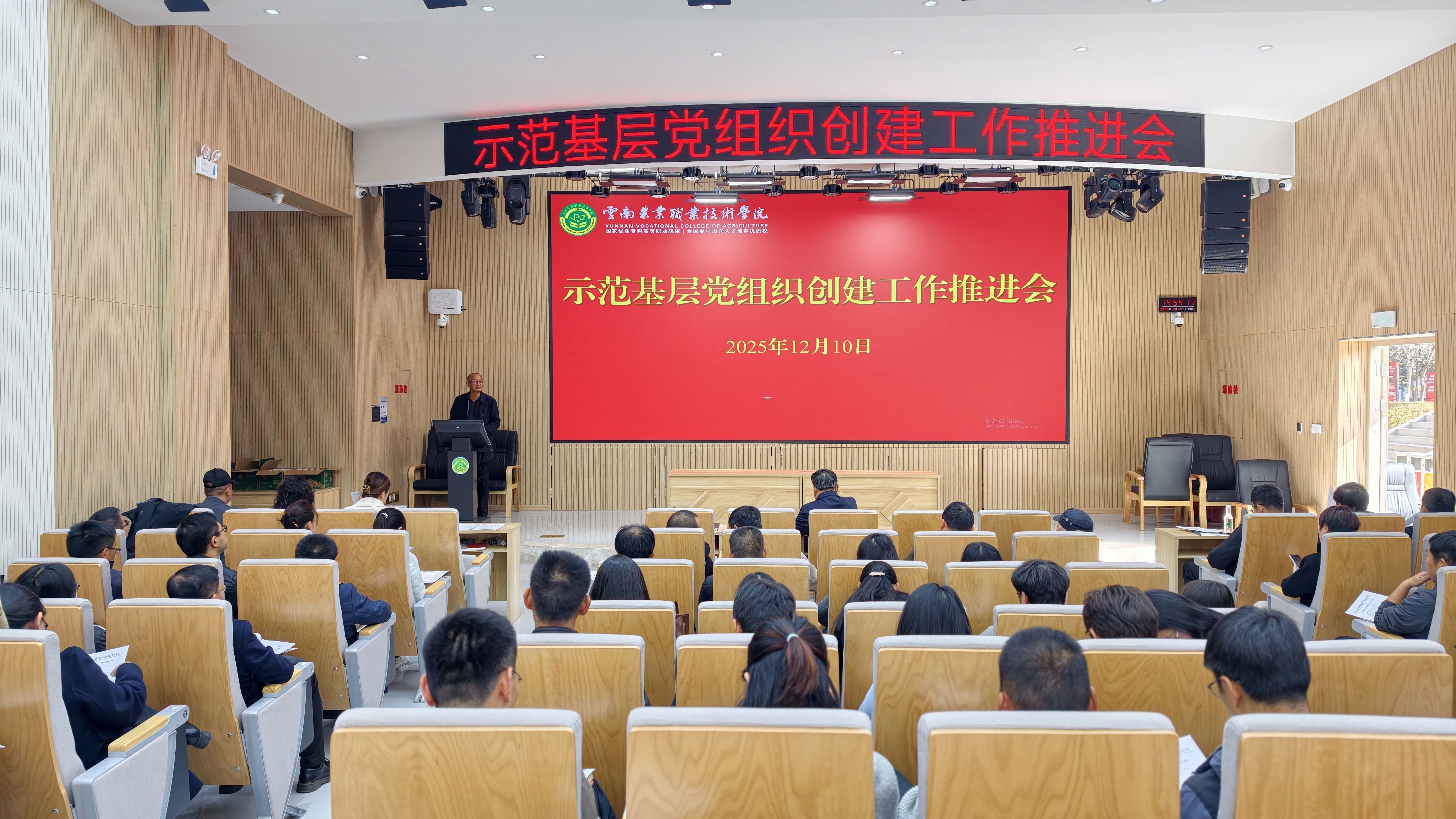 通知中心12月10日下午,学校党委在小哨校区综合楼一楼报告厅组织召开示范基层党组织创建工作推进会。会议由学校党委副书记孙继先主持,学校党委书记文俊出席会议并作讲话。各基层党组织书记、副书记,各二级学院院长、专职组织员,办公室、纪检监察处、组织部、宣传部、统战部、教师工作部、学生工作部、校团委、离退办等部门中层干部及有关人员参加会议。