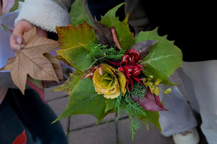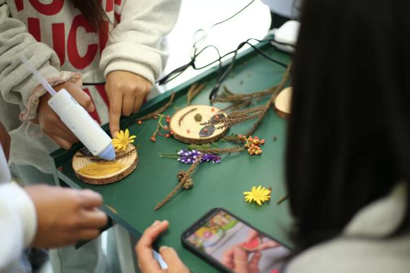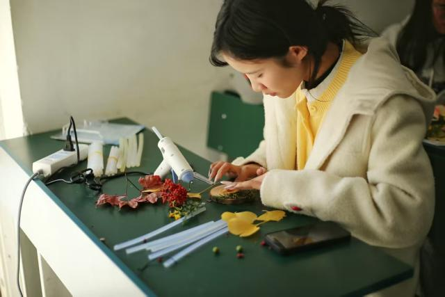 活动现场十分热闹,创作桌上摆满了各种各样的自然材料:火红的枫叶、金黄的银杏叶、宽大的梧桐叶,再加上松枝和野果,成了大家的创作素材。有人用大片梧桐叶做底子,搭配红枫和松枝,用棉线缠绕固定,扎成一束束带着秋意和生机的落叶花束;有人用热熔胶把修剪好的落叶和野果固定在原木片上,做成小巧的桌面装饰摆件;胶片组的同学则把压平的落叶放进透明胶片里封好,边缘系上简单的丝带,做成印着秋景的书签和挂饰,留住落叶的美好。大家专注创作的身影里,藏着把“无用”变“有用”的巧思,彼此交流心得的笑声,给深秋的校园添了不少活力。