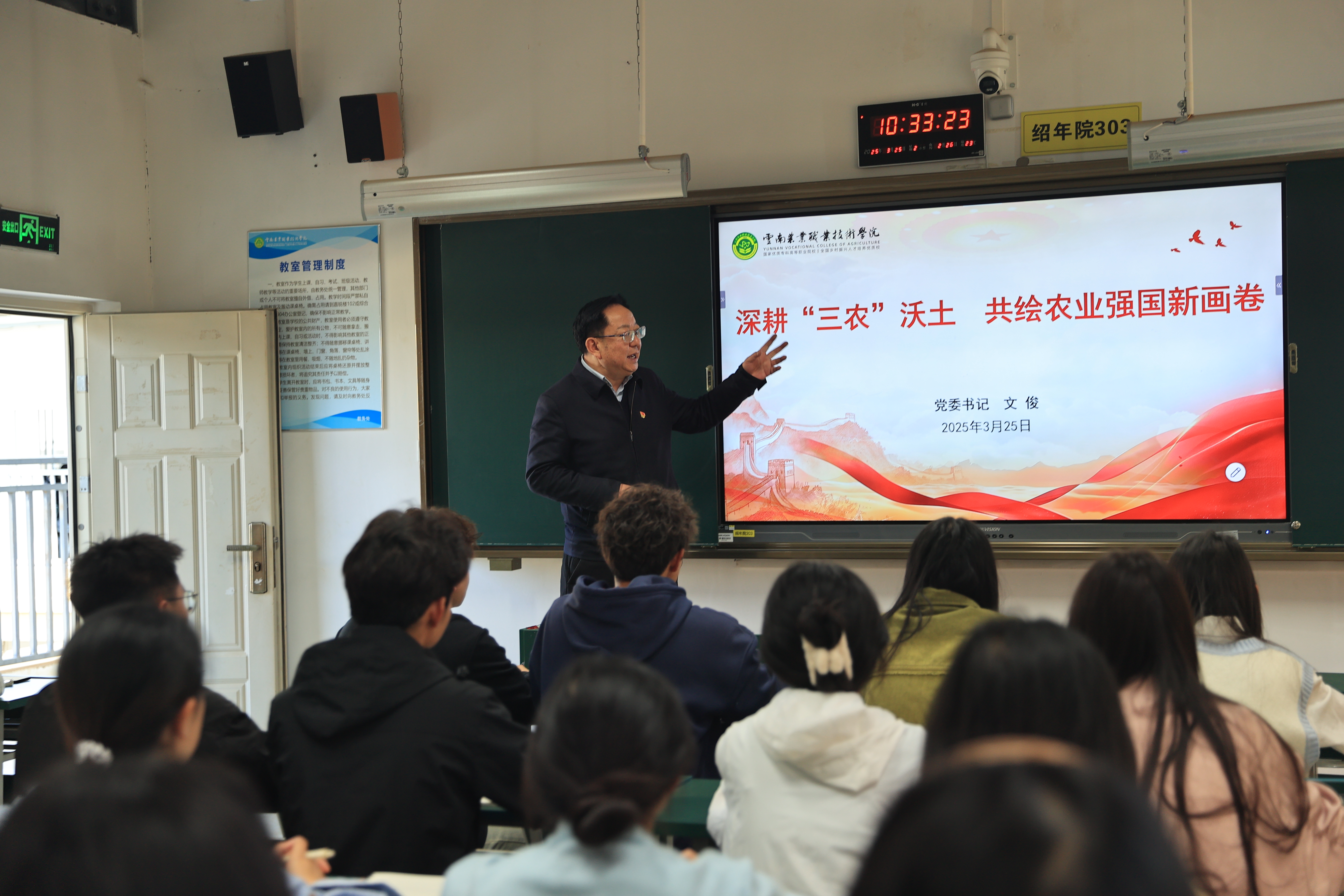党委书记文俊以《深耕“三农”沃土 共绘农业强国新画卷》为主题,通过政策解读、案例剖析与互动交流,引导青年学子将个人理想融入乡村振兴国家战略。鼓励同学们扎根“三农”领域,为实现农业现代化贡献青春力量,牢记习近平总书记对云南的殷殷嘱托,点亮助力乡村振兴的璀璨星河。