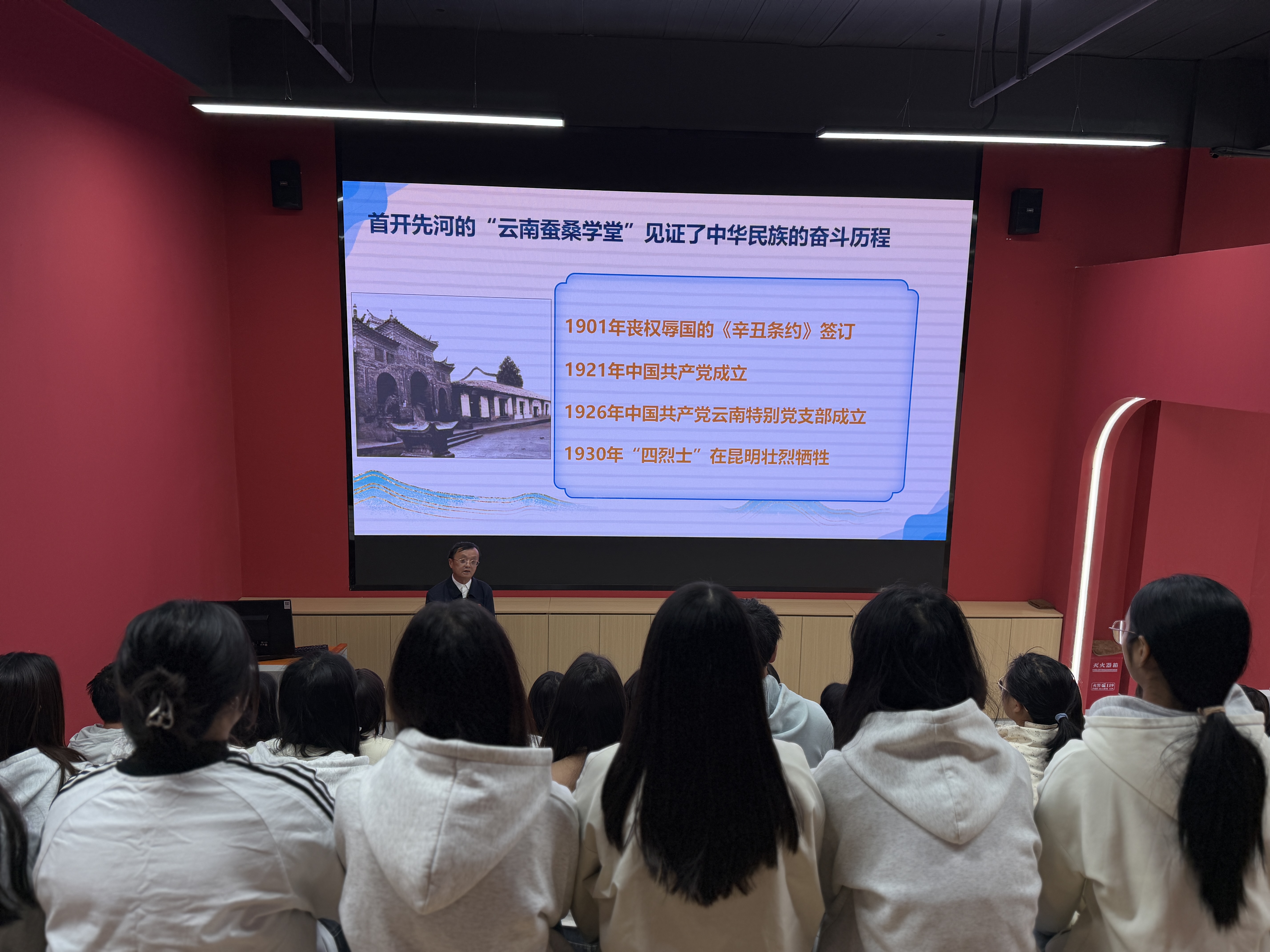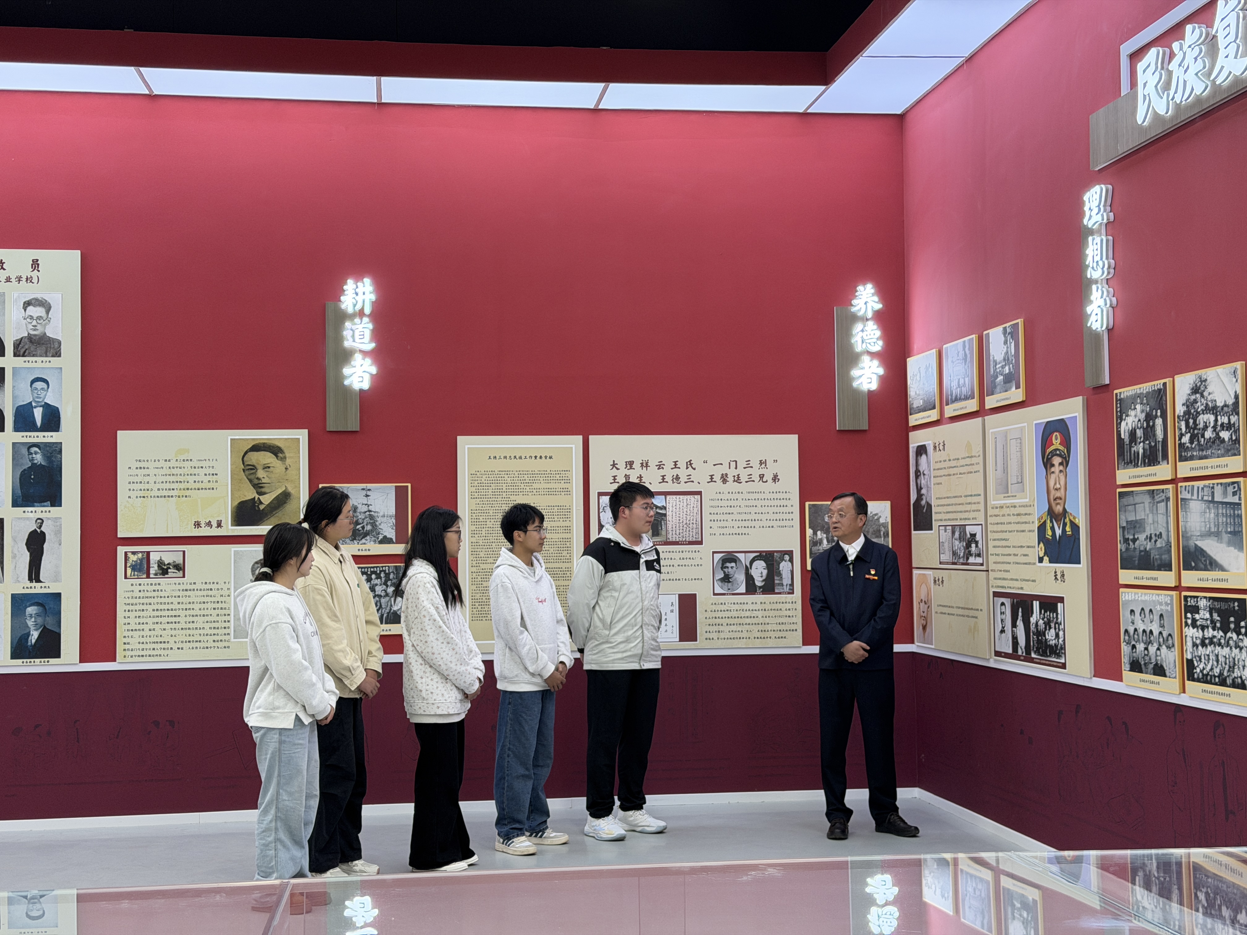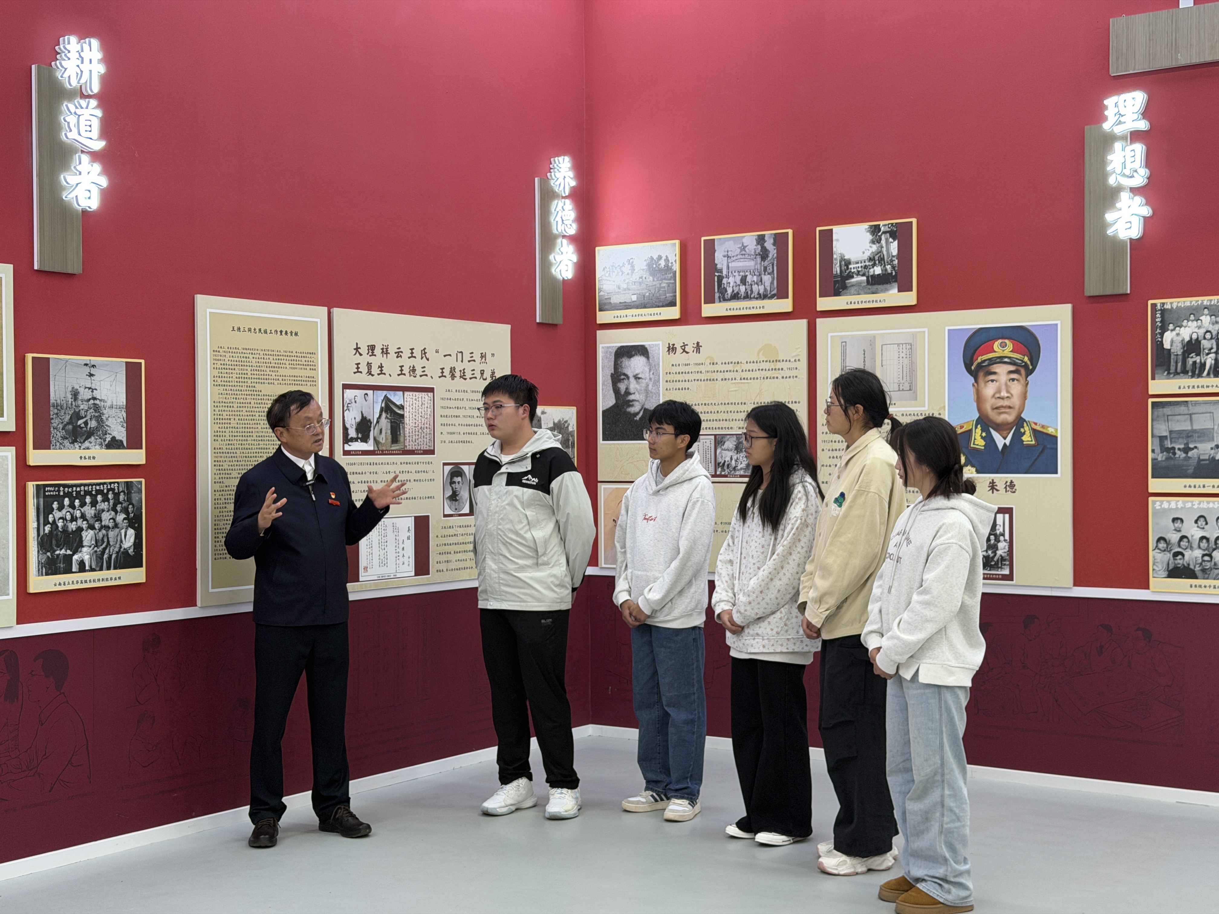 在展馆校史文化展区,主讲人结合学校120余年办学历程,系统讲述了林绍年、朱德、王德三、李万彬等一代代农职先贤与优秀校友的奋斗故事。从1904年云南蚕桑学堂开创云南职业教育先河,到革命先烈为民族解放英勇献身;从抗战时期师生投身救亡图存,到新时代农职学子扎根边疆、服务民族地区发展,学校始终与国家命运、民族复兴同频共振。课堂深入阐释学校“耕道、养德、理想、开拓”的校训精神,勉励青年学子以先辈为榜样,把个人成长融入民族团结进步与云南地方发展事业。