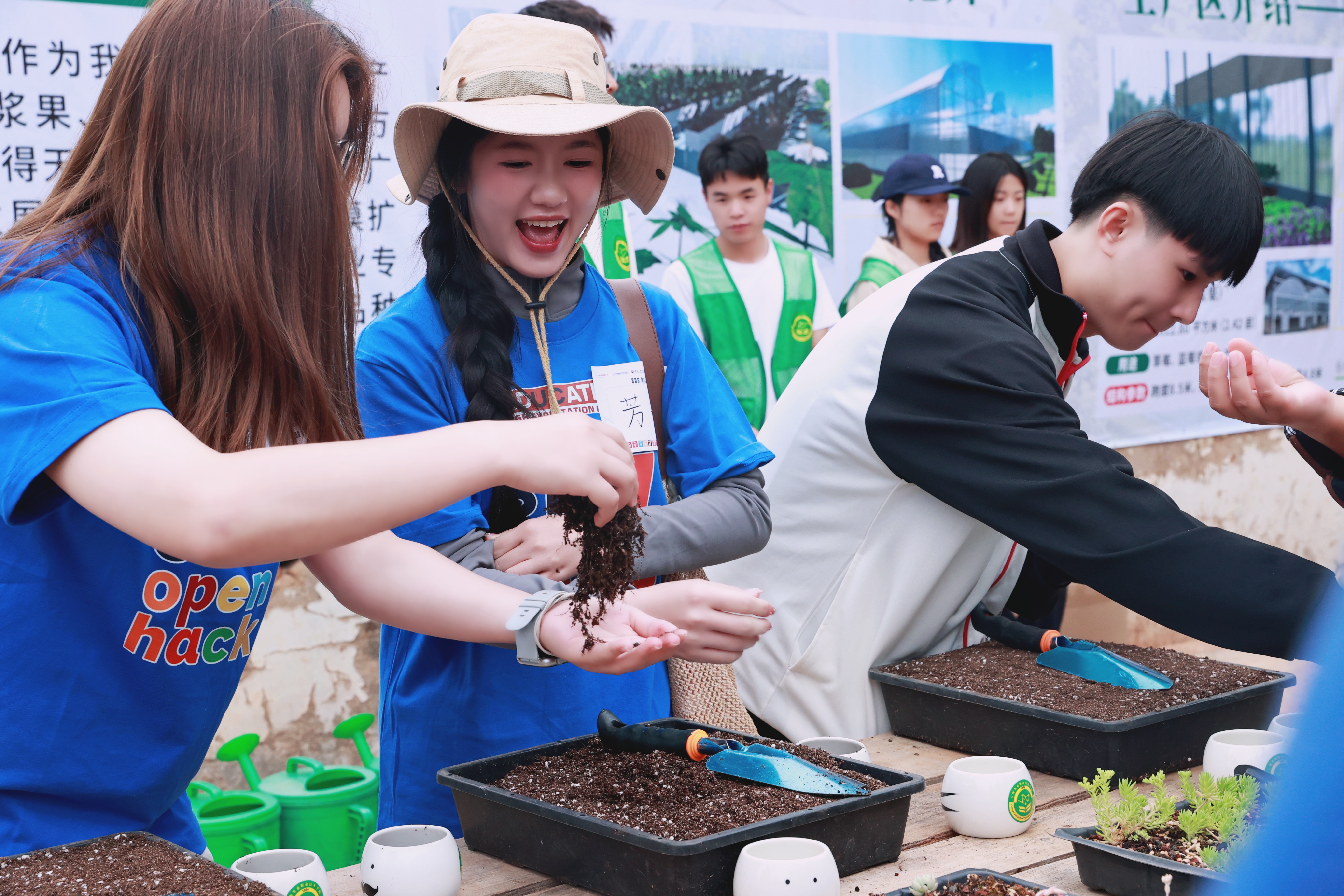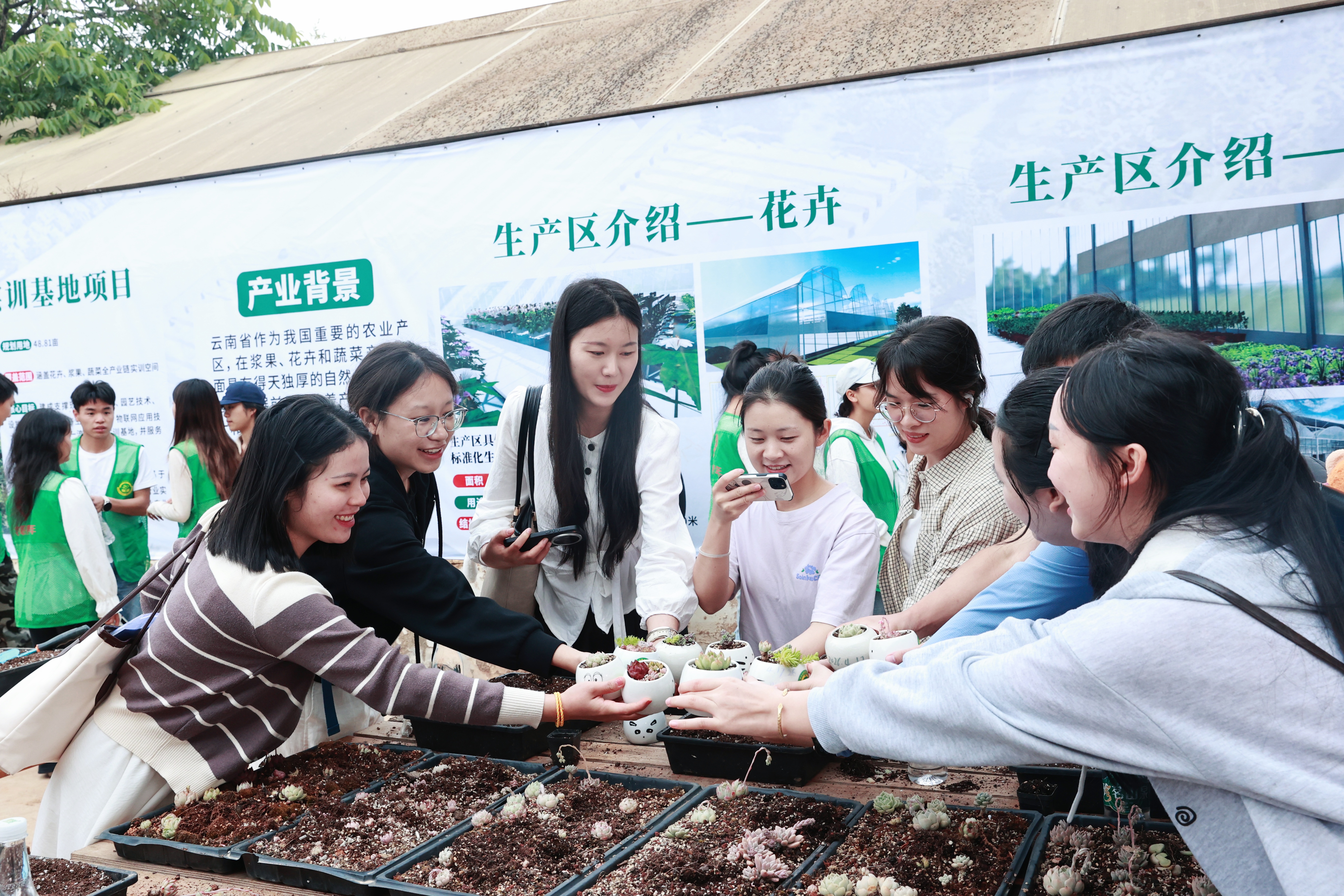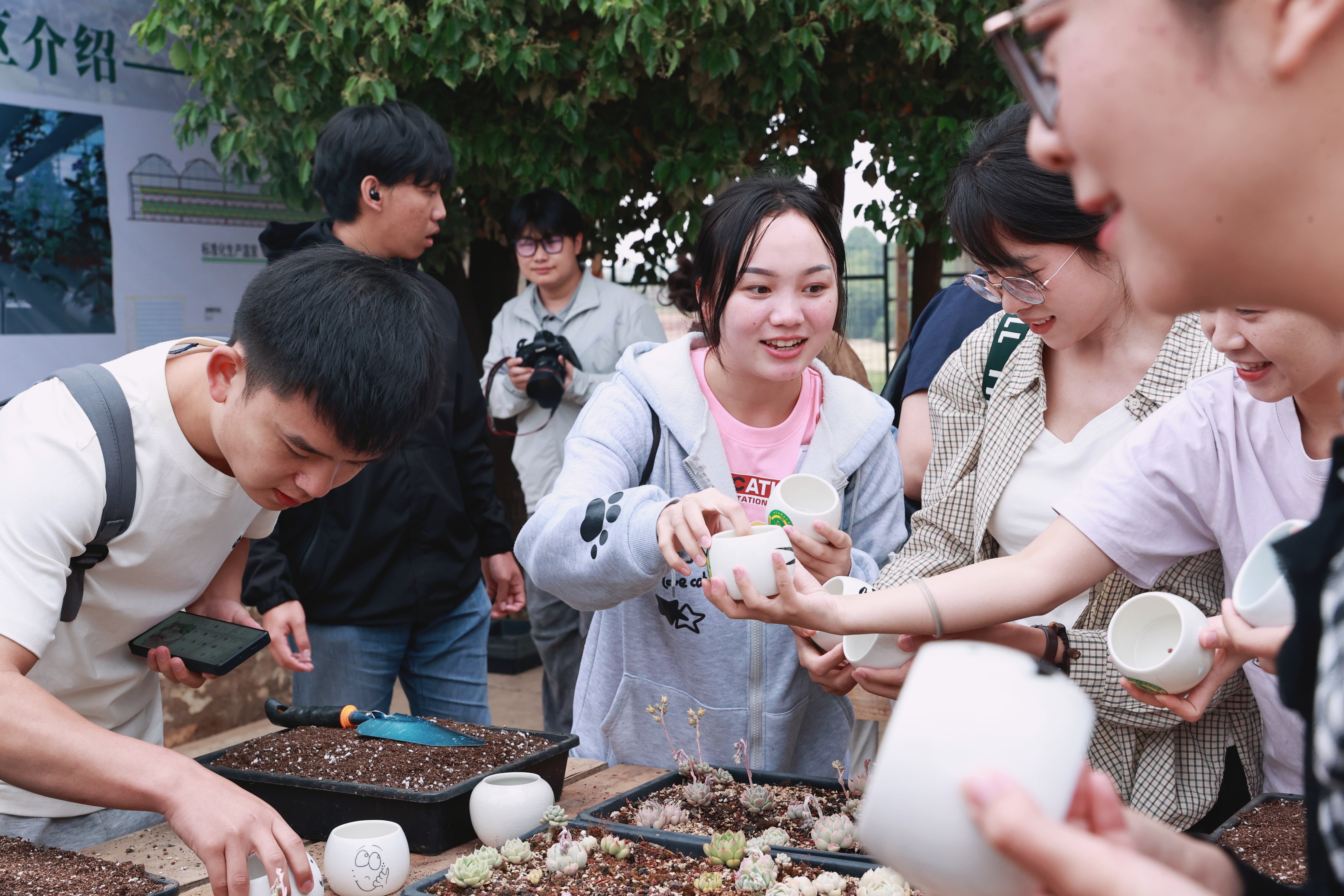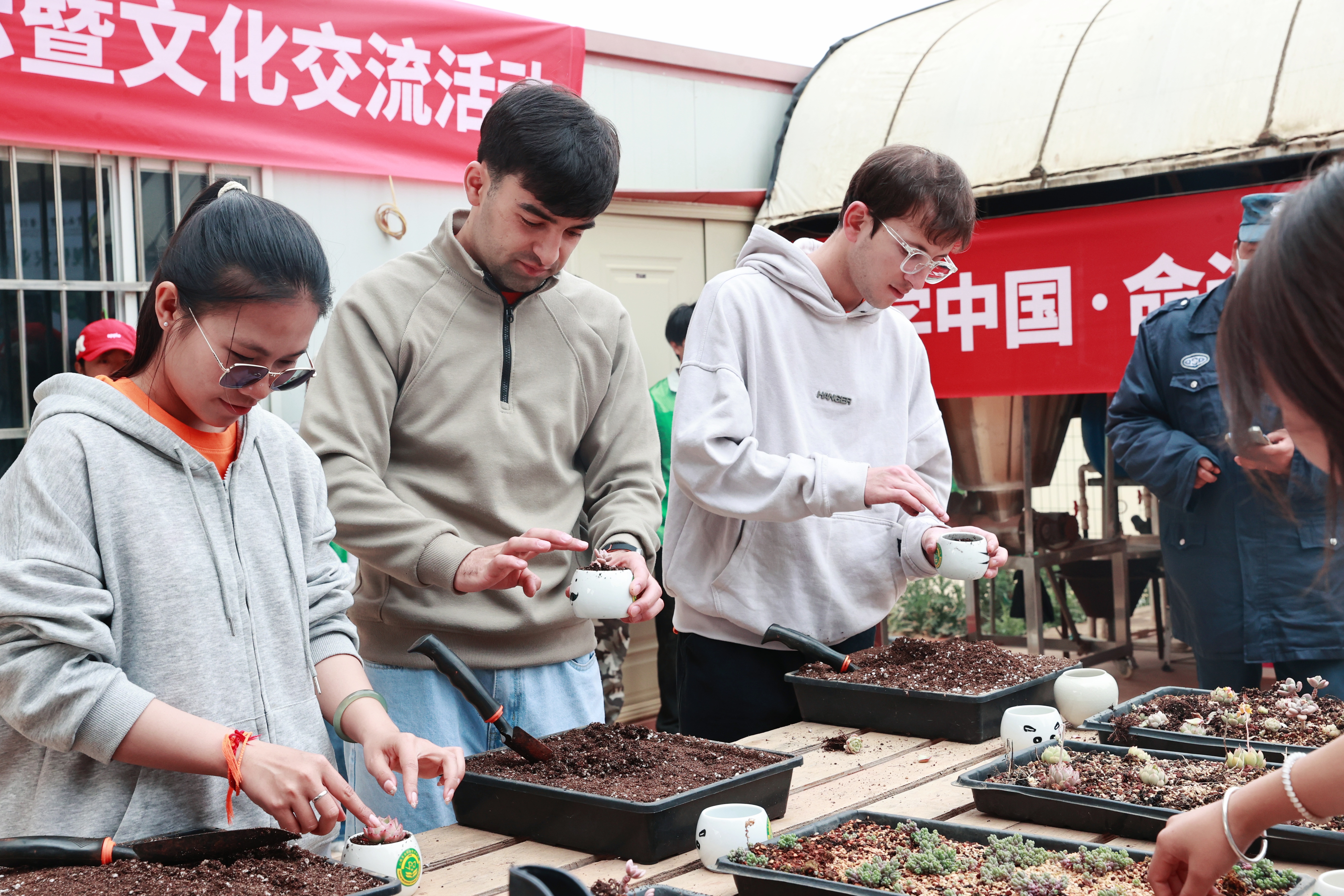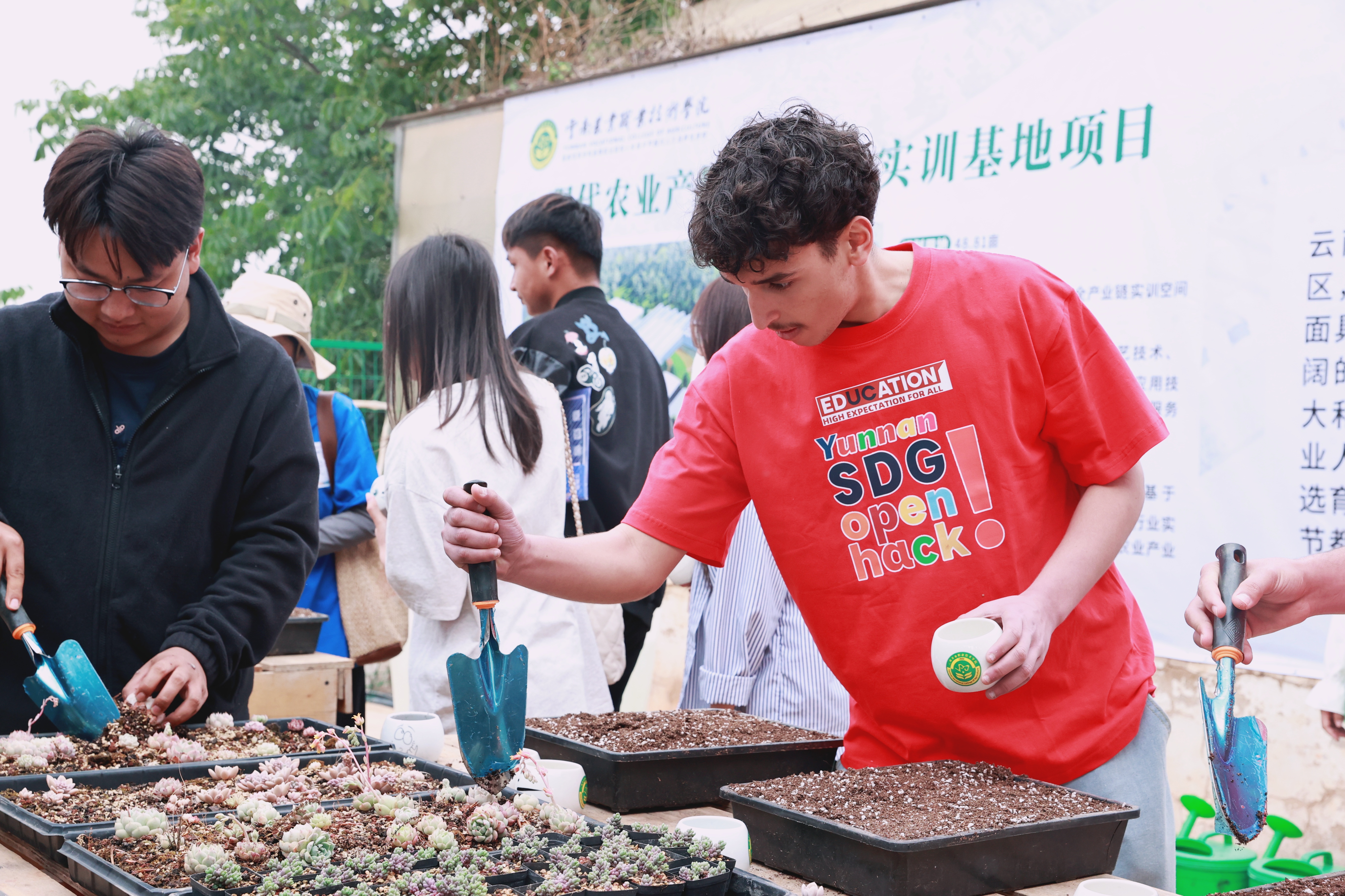 在学校现代农业实训区,来访师生实地观摩特色农业实训成果,参与多肉栽培体验,在动手实践中感受园艺技能与劳动教育魅力,为SDG创新创业挑战赛注入农业产业创新灵感。现场交流氛围热烈,中外青年围绕专业学习、技能实践、文化习俗等话题深入互动,展现出开放包容、互学互鉴的青春风采。
