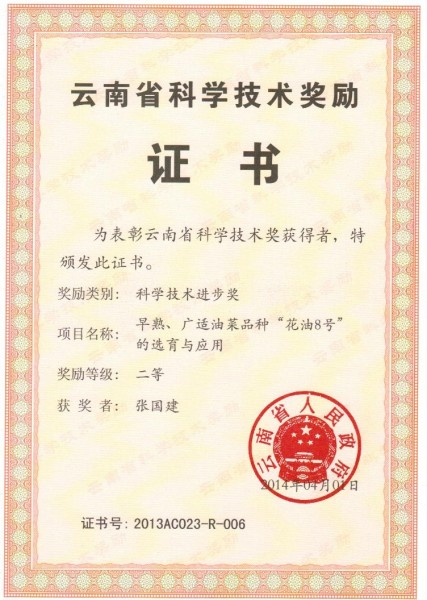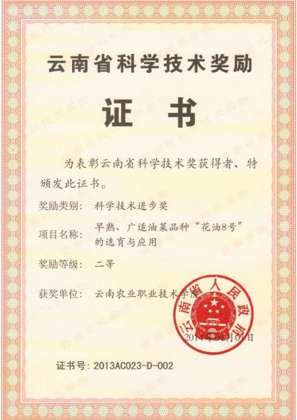 2013年学校再获佳绩,申报的早熟、广适油菜品种“花油8号”的选育与应用获云南省科学技术进步二等奖。2014年8月26日,云南省委、省政府在昆明海埂会堂召开了隆重的颁奖大会,表彰获奖的单位和个人并颁发了荣誉证书。其中,beat365官网参与项目的主要完成人、学校科研产业处处长张国建老师获云南省科学技术进步二等奖。(科研产业处 党委宣传部 供稿)