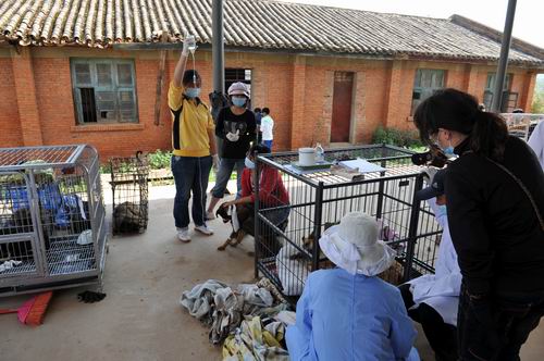 安置在金沙路未通车的露天路段,因缺乏专业技术人员救治护理,有的狗狗死亡、有的奄奄一息、少数狗狗已经逃跑,现场慌乱但不知下一步如何处置。畜牧兽医系的教师对现场情况进行观察后认为,如果任其在市区继续安置,可能引发严重的兽医公共安全隐患。狗的排泄物随意丢弃、污染环境,可能引发人畜共患疾病。爱心人士虽然有爱心,但因为缺乏相应的专业技术指导,心里非常着急。王家桥派出所维护秩序的民警,也建议学院能站出来帮一帮这些缺乏有效组织和统一行动的爱心人士,拿出一个整体解决当前困境的办法。学院畜牧兽医系出于解决兽医公共安全的社会责任感,从以人为本,兼顾动物福利的人文关怀和人道主义大局出发,秉承“牧者,爱人,爱动物;医者,仁心,济苍生”理念,根据畜牧兽医系现有的饲养管理和医疗设备等条件,承诺可接收100只狗狗进行救助。