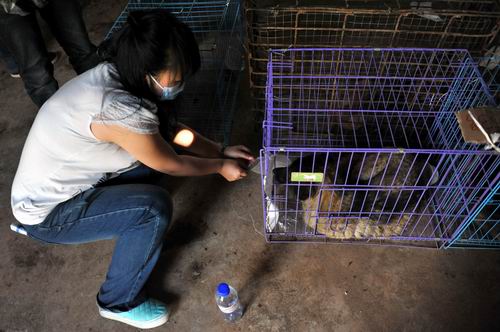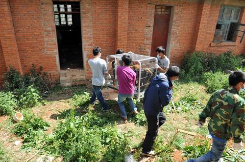 爱心组织和人士当即派人来到学院小哨校区畜牧兽医实训基地考察,认为基地虽条件简陋不尽如意,总比在市区露天不规范的护理条件好,决定把截下的400多只狗狗全部转运到小哨。4月22日下午4:00至23日凌晨3:00,爱心组织租用搬家公司的16辆车将全部狗狗转运到小哨校区临时安置点。学院畜牧兽医系成立了“兽医爱心犬救治团队”,下设“兽医组”、“护理组”、“物资保障组”,组织具有国家执业兽医师从业资格的教师拟订了救治狗狗的方案,并与爱心组织共同明确学院畜牧兽医系和爱心组织各自的责任。