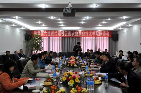 首先,崔金赋书记代表学院向巡视组领导汇报了我院办学的基本情况,从1904年创办“蚕桑学堂”走过的108年悠久而光荣的办学历史,到现阶段不断发展壮大的办学水平和办学规模。崔书记着重汇报了我院办学所取得的主要成绩,以及办学过程中面临的问题和困难。崔书记着重汇报了我院办学取得的五大成绩:一是办学规模不断扩大,在校生规模由2008年的4139人增加到2011年的5554人,增长34%。开设专业由2008年的31个增加到2011年的38个,增长23%。二是办学水平不断提升,2010年年底学院已经被省财政厅、省教育厅立项为云南省省级示范性高等职业院校建设单位,目前省内共有6所学校获准立项。三是办学特色逐步彰显,第一,高度重视实践课程和学生实习实训,为学生提供更多的动手实践机会,凸显了农业职业教育的农业特色和职业特色,这是我们最为显著的特色。第二,充分发挥小哨作为云南省畜牧业科技中心的区位优势,聘请周边单位实践型专家学者直接给学生授课,经常安排学生到周边单位参观实习,构建了良好的校企校政合作运行机制,实现理论教学和实践教学的紧密结合,形成了独树一帜的小哨地域特色。第三,充分发挥行业主管的优势,紧紧依托行业办学,主动融入行业发展,得到了农业厅的高度重视和大力支持,彰显了职业教育的行业特色。四是国际合作成效显著,学院与日本国长野县南安昙农业高等学校和泰国七所职业院校先后进行了长期的、多批次、广泛的交流合作,与泰国职业院校互派留学师生已有8批次300余人次。学院多次接待泰国职教代表团来校访问考察,有100多位教师前往泰国考察职业教育。在农业厅的支持下,目前正在开展“中国云南—柬埔寨班迭棉吉省农业科技友谊示范园”项目的实施工作。今年我院已被省教育厅批准正式在东南亚国家招收留学生。五是体制机制日趋完善,为实现资源优化组合,学院党委深入推进内部管理体制机制改革,充分调动广大教职工的积极性和主动性,增强了学院发展的活力。崔书记向巡视组领导还汇报了学院现阶段改革发展面临的四大问题和困难:一是基础设施十分薄弱,学院现阶段基础设施难以满足办学需求,无法与本科院校相比,即使在同类院校中也处于落后的状态,也与108年悠久的办学历史极不相称。二是昆明新机场建设严重影响学院发展,小哨校区正好位于新机场运营后飞机航线的正下方,被空港经济区规划为生产防护绿地,新机场运营后将遭受70分贝以上的噪音影响,不再适宜办学。空港经济区规划局对学院申报的基建规划手续不予审批,建议学院另行选址建设新校区。三政府投入不足。四是人员编制与办学规模不相适应。