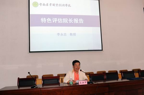 省农业厅孙海清副厅长致辞。孙副厅长简要回顾了学校110年的办学历程,介绍了学校2002年组建高职院校和这十年来的改革发展,充分肯定了学院办学为云南农业发展做出的重要贡献。既服务社会也提高了质量水平,凸显了特色。他指出学院招生形势严峻,师资力量有待加强,基建不足,又因新机场的建设影响学院的搬迁与办学。希望在评估组专家的指导帮助下,进一步凝练学院的办学特色。并以特色评估为契机,充分吸取评估组专家的意见,以评促建,以评促改,不断加强学院的建设!