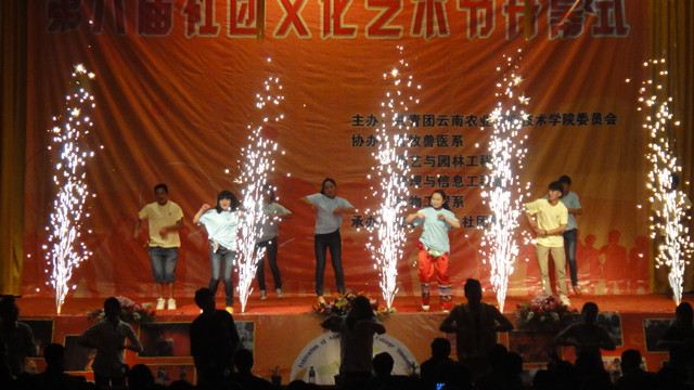 花团锦簇,吹拂今日绿色情怀;充满希望,绽放今日迷人的光彩。此次开幕式由舞蹈、歌曲、朗诵、话剧和武术组成。舞蹈《欢天喜地秧歌情》正式拉开开幕式的帷幕,带着同学们进入到不一样的农职校园,舞蹈时而欢快,时而轻柔。诗朗诵《云南干旱》震撼了在场每一个人。精彩不断,创意累出。开幕式在阵容强大、活力四射的《最炫民族风》中落下帷幕。