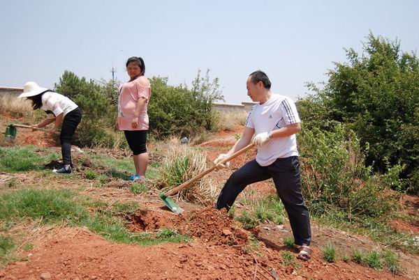 中午12点40分,老师们与参加植树学生向农牧场进发。烈日炎炎,抵挡不住老师同学的热情。老师们亲身示范,同学们积极实践。老师与学生进行自由组合,80多名师生分成30多个小组,为100棵树苗种植做好准备。短短1个小时,100棵树苗的坑位已经按照50公分乘50公分的规格挖好。下午,树苗运达农牧场,师生们顶着烈日,排成长队,团结一心,如火如荼地进行树苗的卸载。各小组分别把树苗种入各自挖好的坑中。由于农牧场缺水,让树苗成活成了一大难题。但同学们勇于克服困难,用盆用桶抬水提水为树苗进行浇灌。晚六点半,为期一天的植树活动终于落下帷幕。四个教研室党支部学生党员自愿每周轮班浇水施肥,以保证树苗在干旱缺水的状态下成活。