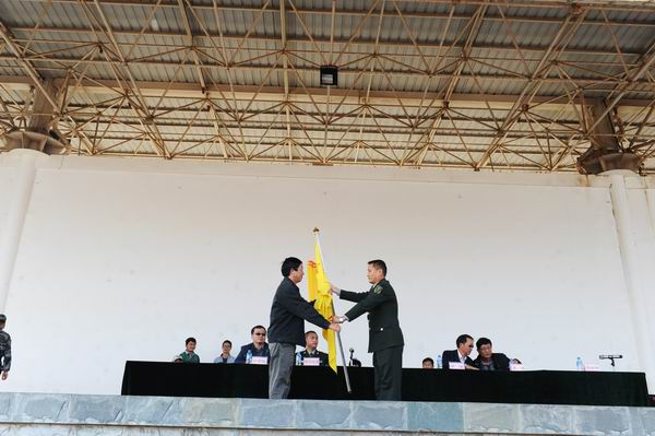 党委书记崔金赋为军训团授旗,把学院校旗授予昆明民族干部学院一大队政治委员司马迅灵。