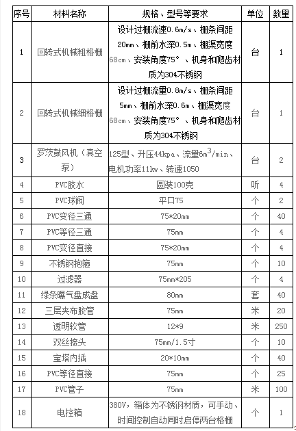 1.2 采购内容:通过公开询价方式确定1家入围单位,作为beat365在线唯一官网污水处理站格栅机风机设备采购项目供货商,供货商按采购清单提供设备,并完成设备的采购安装调试及售后服务。