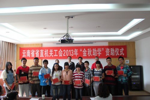 十年寒窗,金榜题名,金秋助学,成就梦想。819日上午,省直机关工会在我院举行2013金秋助学活动助学金发放仪式,学院11名品学兼优考上二本以上家境贫困的职工子女每人分别获得3000元的助学金。云南省省直机关工会陆溪部长、云南省农业厅机关党委副书记王俊秀、学院党委书记崔金赋、党委副书记赵刚出席会议,会议由党委副书记赵刚主持
