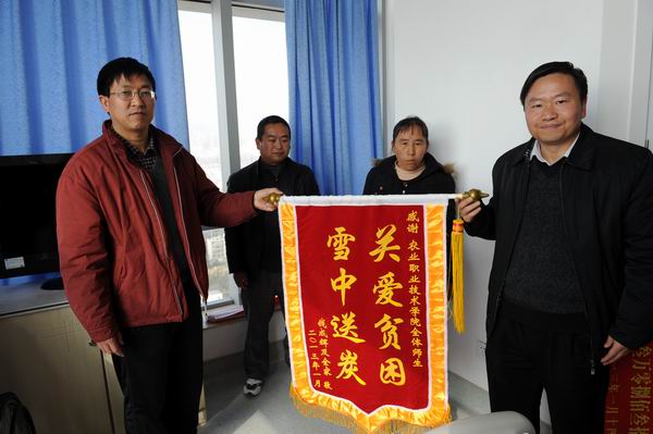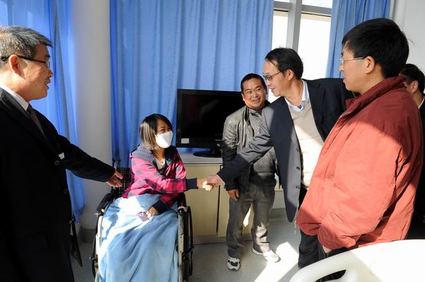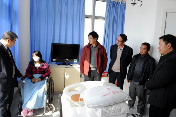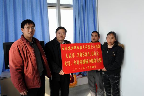 2013年元月28日上午,党委书记崔金赋、院长彭志远、副院长俞浩前往大观路解放军昆明总医院(43医院)住院部血液科,代表学院全体师生看望慰问畜牧兽医系2012级动检一班钱成辉(女)同学,并把全院大学生献爱心、募集捐献的30834元人民币转交给钱成辉同学的父母,表达了全体师生对钱成辉同学的美好祝福和深切关爱。学生工作处周诚处长、党委宣传部蔡永生副部长,院团委曾品老师、班主任廖启顺老师等陪同慰问。