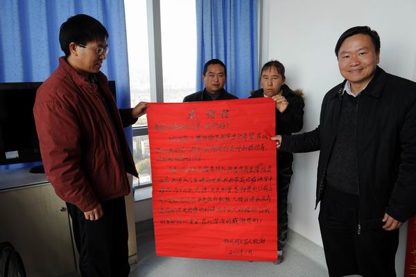 崔书记、彭院长、俞副院长对钱成辉同学十分关心,问寒问暖,鼓励她树立战胜病魔的信心和决心;三位领导以个人名义当场捐赠2千元,对病人的父母表示亲切慰问。钱成辉同学的父母对三位学院领导亲临医院慰问表示衷心感谢!对学院全体师生的爱心救助表示衷心感谢!并对学院的关心、帮助回赠了锦旗和感谢信。