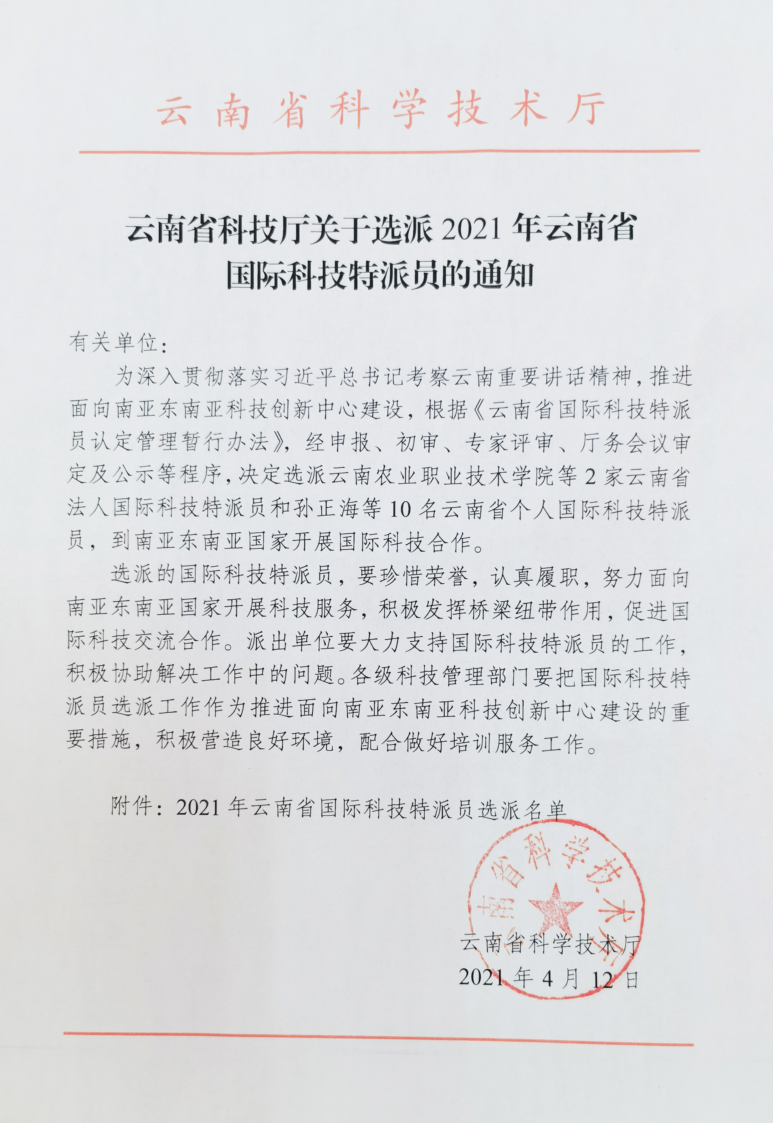 通知中心近日,云南省科技厅发布《关于选派2021年云南省国际科技特派员的通知》,经申报、初审、专家评审、云南省科技厅务会议审定及公示等程序,决定选派2家云南省法人国际科技特派员和10名云南省个人国际科技特派员,以推进面向南亚东南亚科技创新中心建设。我院获批入选2021年云南省法人国际科技特派员名单。
