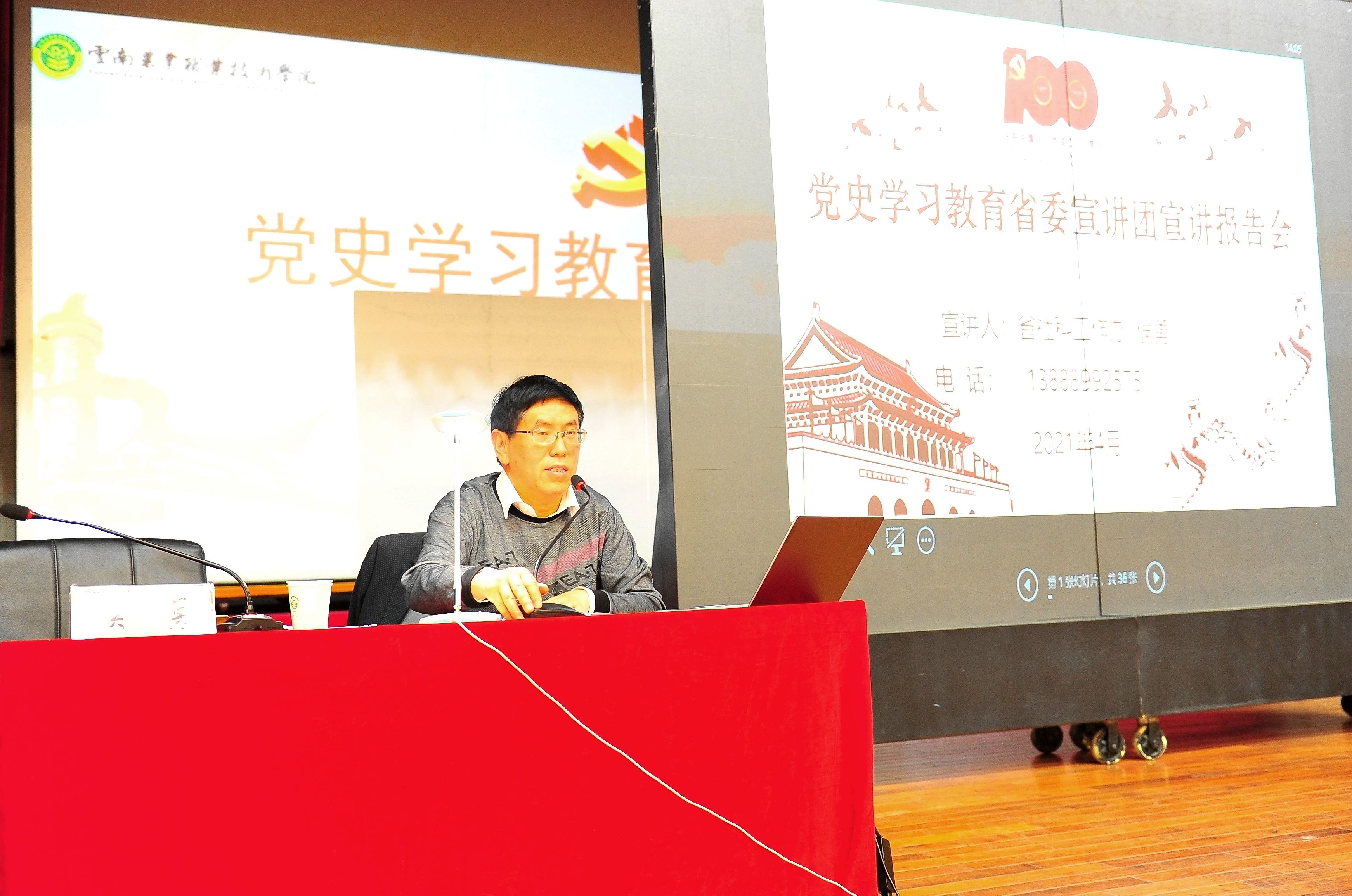 党委书记崔金赋同志作总结。他表示,侯勇老师将历史与现实相结合,以一段段可歌可泣的史实、一个个鲜活生动的案例进行讲解,结合大量生动事例尤其是云南当地的红色资源,对党史学习教育重点内容进行详细解读,立意深远、条理清晰,深入浅出,给师生们上了一堂全面系统的党史课,对全院师生深入学习党史具有启发意义。崔金赋书记要求广大师生要以此次报告会为契机,以学习党的历史为重点,做到知史爱党、知史爱国,在学习领悟中坚定理想信念,在奋发有为中践行初心使命。