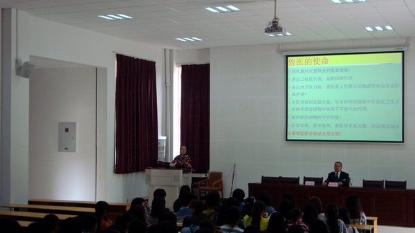 教研室王锐老师分层次从不同的角度以详实的内容及丰富多彩的图片对美丽小哨航空城、畜牧城、职教园区独特的地理位置作了介绍、又饱含深情地向同学们诉说了beat365在线唯一官网古老而年轻的办学历程;骄傲而自豪地介绍畜牧兽医学院和自始自终以“兽医、兽医永争第一”为口号的兽医专业群;末了,让事实说话,对兽医专业群的四大王牌专业-----兽医专业、兽医与兽药专业、动物防疫与检疫专业、宠物养护与疫病防治专业作了剖析,特别是按国际惯例对官方兽医、执业兽医、乡村兽医都一一作了说明。一桩桩、一件件鲜活的事例打动了同学们的心,同学们听看《兽医之歌》视频引发了共鸣。