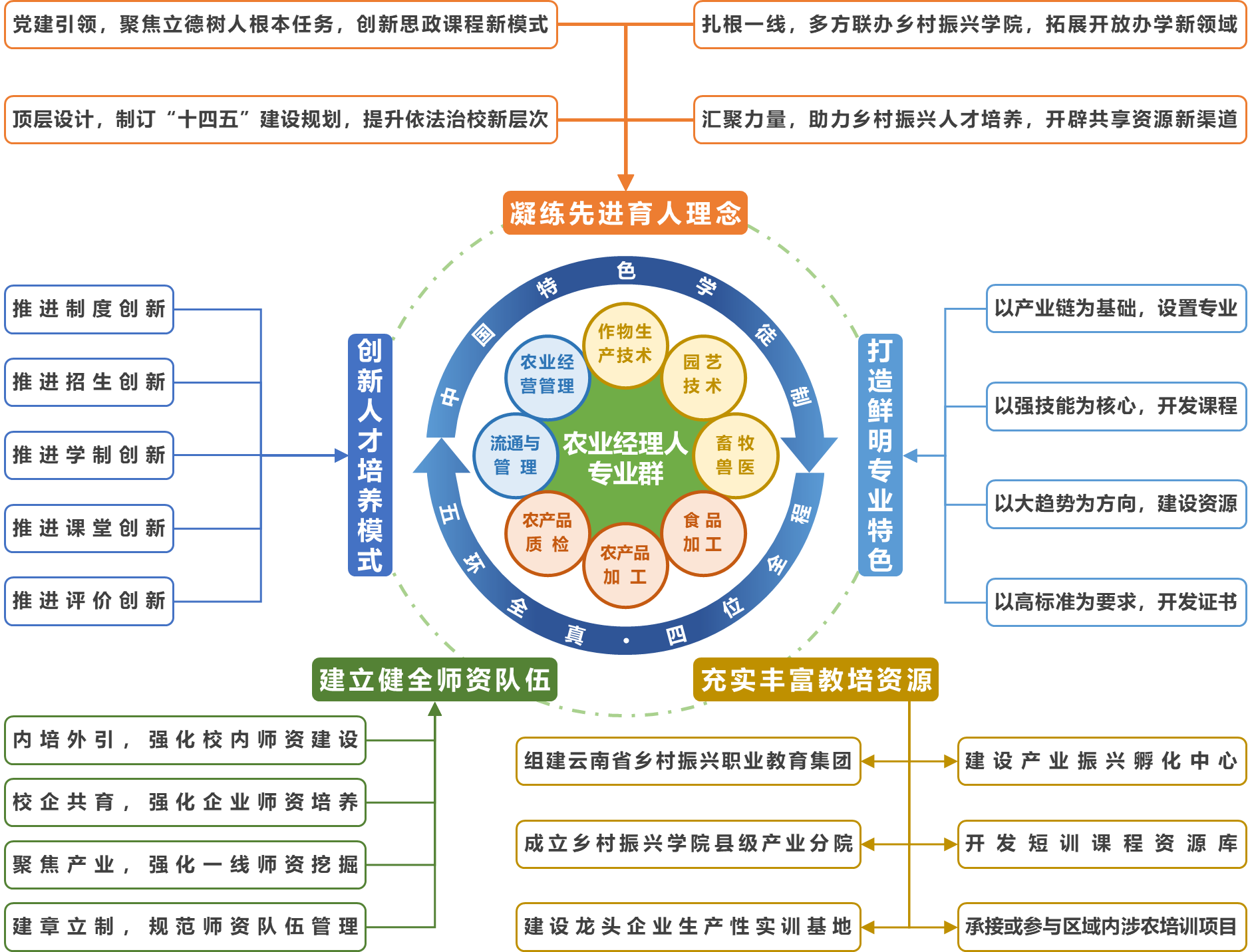 未来,我院将以习近平新时代中国特色社会主义思想为指导,贯彻党的十九大和十九届二中、三中、四中、五中全会精神,落实《国家职业教育改革实施方案》的部署,执行党的教育方针和立德树人根本任务。贯彻《乡村振兴战略规划(2018—2022)》的要求,落实“百万高素质农民学历提升行动计划”,聚力乡村人才振兴,创新校内制度改革,“推倒围墙”办学,培养爱农村、懂技术、善经营的高素质农民。主动承接《职业教育提质培优行动计划(2020—2023年)》的项目任务,树立“产教融合、校企合作”的职业教育发展理念,用任务驱动不断夯实基础,用项目引领持续补齐短板。着力推进学校职业教育改革,提升乡村振兴人才的育人理念;着力谋划基于区域优势产业的专业布局,推动专业特色发展;着力推进“中国特色学徒制”的人才培养模式改革和“书证融通”的课程体系建设;着力选拔和培养来自企业或生产一线的高技能人才,健全充实乡村振兴人才培养师资队伍;着力拓宽政企校的合作通道,多方共建满足实践教学、技术展示、创业孵化等功能教育陪训资源;开辟一条专业布局符合高原特色农业发展的,师资队伍满足重点人群培养的,实践资源紧密结合生产实际的乡村振兴人才培养之路。(乡村振兴学院供稿/文、图:李一源/审核:杨筱莹/责任编辑:李玛)