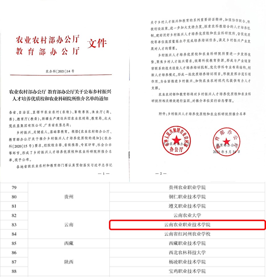 通知中心5月26日,农业农村部科技教育司、教育部职业教育与成人教育司联合正式发布乡村振兴人才培养优质校和农业科研院所推介名单。全国共有101所高校和科研院所入选名单,云南省有3所院校,我院作为省内唯一高职院校榜上有名。