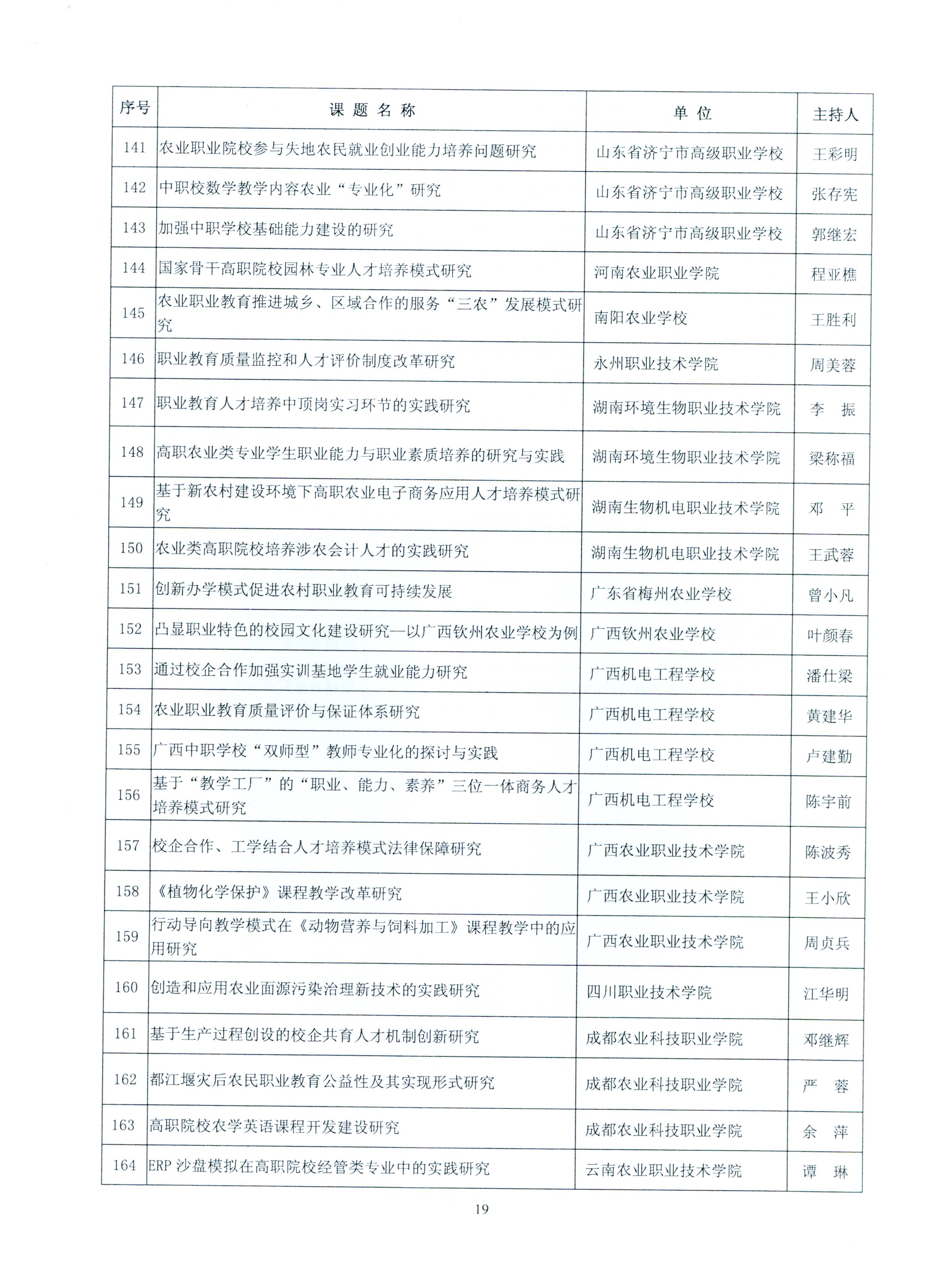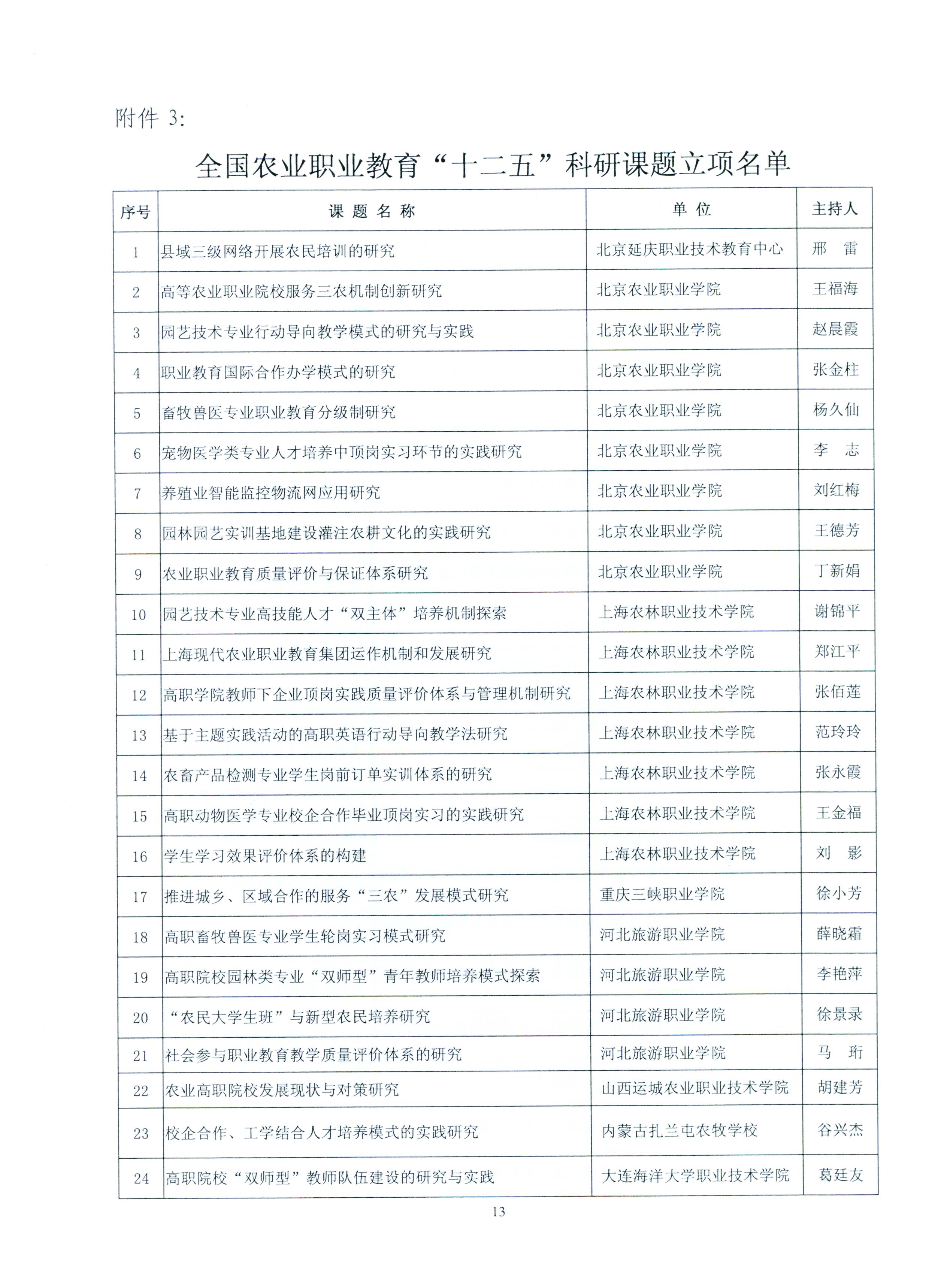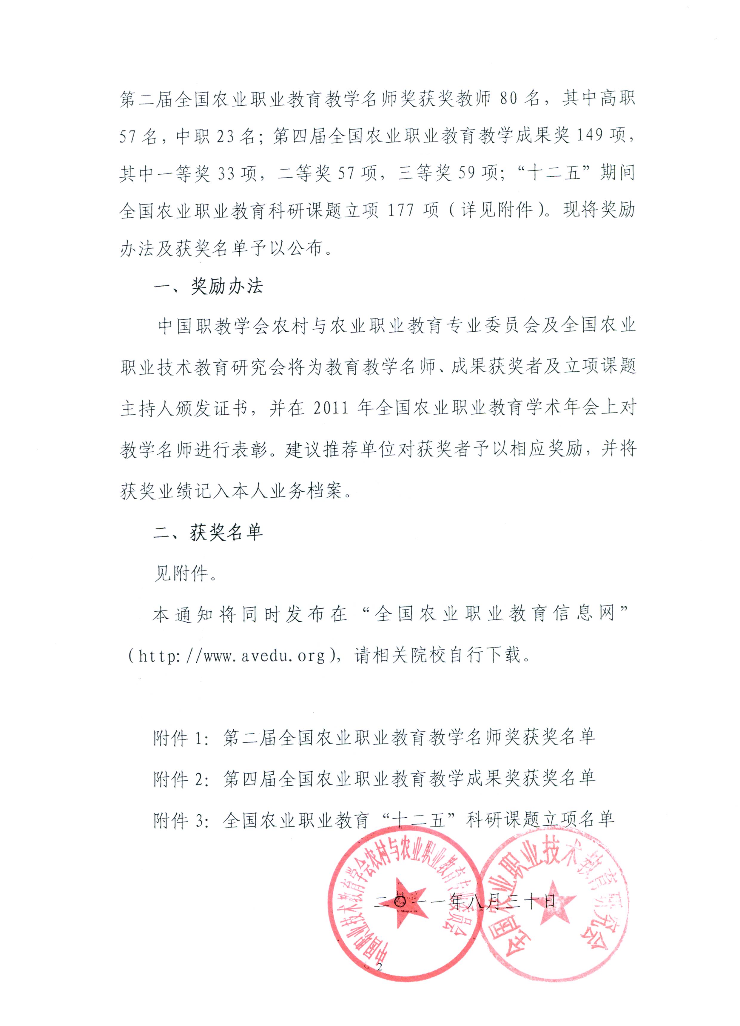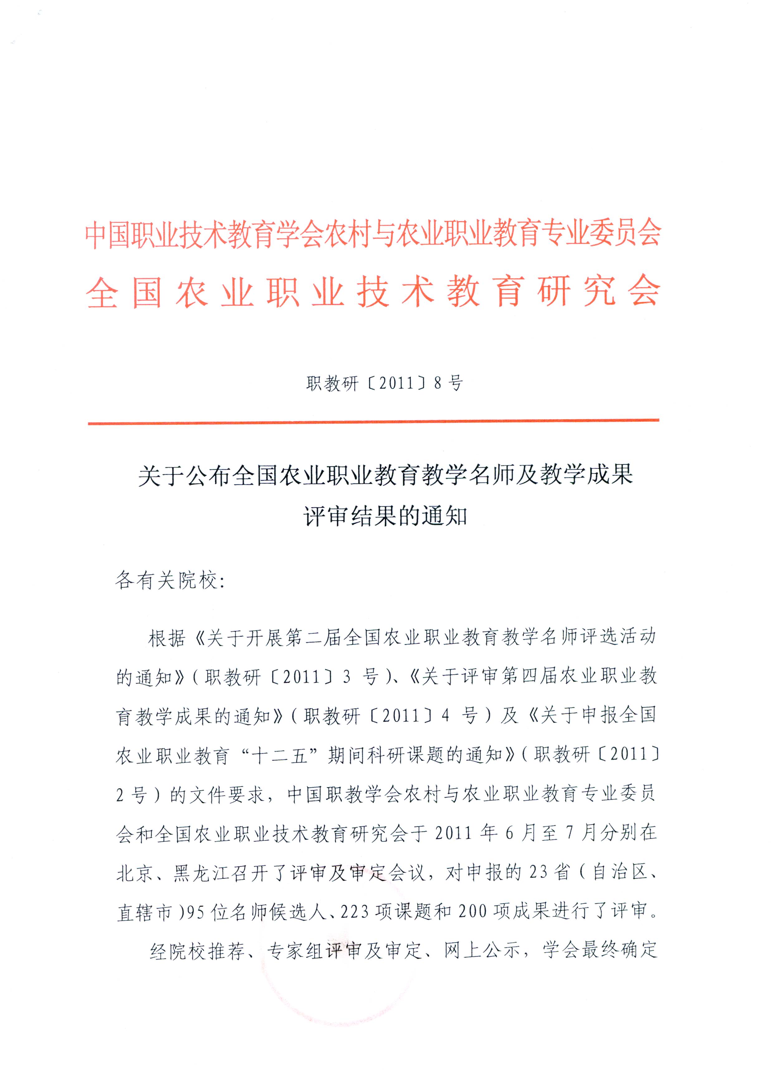 据中国职业技术教育学会农村与农业职业教育专业委员会全国农业职业技术研究会,《关于公布全国农业职业教育教学名师及教学成果评审结果的通知》(职教研〔2011〕8号)。中国职业技术教育学会农村与农业职业教育专业委员会于2011年6月至7月召开评审及审定会议,最终确定“十二五”期间全国农业职业教育科研课题立项177项。