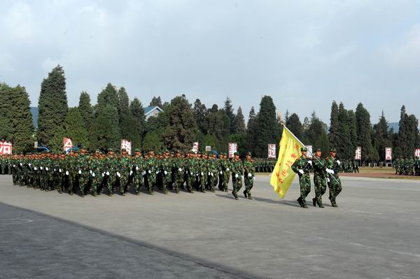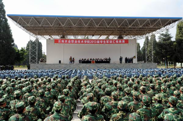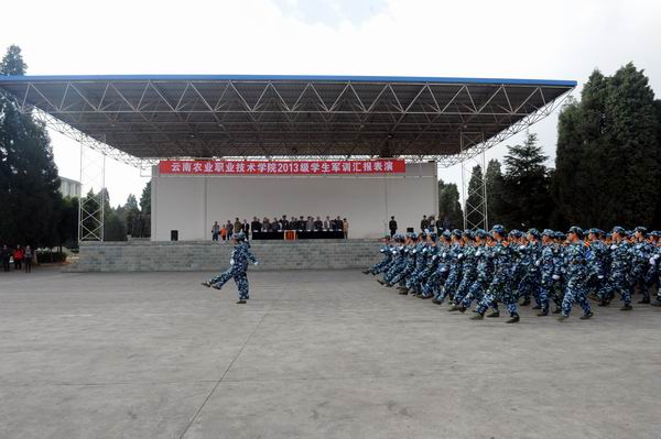 新生军训汇报表演在庄严的国歌声中拉开帷幕,在激昂的《中国人民解放军进行曲》中全体起立迎校旗,阅兵式正式开始。李永忠院长在昆明民族干部学院军训教研室主任朱平大校的陪同下检阅了新生军训队伍。同学们以饱满的热情迎接学校领导的检阅。李永忠院长高声问候:“同学们好,同学们辛苦了!”同学们铿锵有力应答:“努力学习,为校争光!”