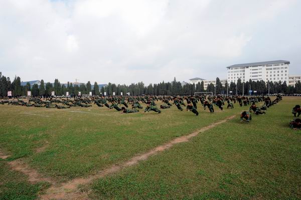 最后,崔金赋书记为本次新生军训作了总结讲话。崔书记说,历时两周的2013级学生军训工作今天胜利结束了,我代表学院党委向承担本次军训任务的中国人民解放军昆明民族干部培训学院领导和官兵致以崇高的敬意!向参与组织这次军训的学院各部门、各系领导、辅导员和带队老师表示亲切的慰问!向胜利完成各项军训任务的2013级全体同学表示热烈的祝贺!崔书记指出,在紧张艰苦的军训中,同学们经受了一次严峻的考验,也获得了终生受益的精神财富。通过军训,同学们学习了军事知识,掌握了一定的军事技能,增强了国防意识,磨练了意志,增强了体质;懂得了如何面对困难,克服困难,如何用坚韧不拔的意志来支配自己的行动,并朝着既定目标不懈努力。我们欣喜地看到:军训期间,同学们不怕苦、不怕累,迈着矫健的步伐,喊着响亮的口号,唱着嘹亮的军歌,认真练好每一个动作,掌握每一个要领,克服一道道难关,真正把这次军训当作是磨练意志、锻炼身体、提升素质的好机会,充分展现了当代大学生的良好形象和精神风貌。刚才的会操,同学们精神振奋、步伐整齐、动作有力,表明本次军训达到了预期效果。军训将伴随着同学们以后的学习、工作和生活,终生受益。崔书记要求同学们,军训虽然就要结束了,但同学们不能把它当作一个终结,而应该当作一个新的起点,要继续发扬军训中养成的优良作风和艰苦奋斗、吃苦耐劳的革命精神,刻苦学习,以优异的成绩和实际行动巩固和发展军训成果。崔书记强调在今后的学习、生活中,同学们要时时处处按照军训期间的标准来严格要求自己,大力弘扬“耕道、养德、理想、开拓”的校训精神,刻苦学习政治理论和科学文化知识,不断完善知识结构,提高自己的综合素养,尤其要注重实践能力和创新精神的培养,争做中国特色社会主义事业的合格建设者和可靠接班人。
