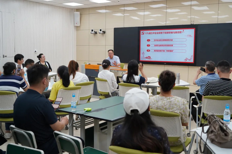 文俊院长以“贯彻十九届五中全会精神 职业院校赋能高质量发展”为主题,从十九届五中全会的主要精神和内容、当前职业教育改革政策背景、高质量发展下的“农职实践探索篇章”三个方面展开讲述,深入剖析了十九届五中全会传达的精神与内涵,梳理了五中全会背景下职业教育改革的重点任务,结合黄炎培职教理念介绍了学院以立德树人为根本,以强农兴农为己任,坚持服务“三农”,聚焦乡村振兴战略,践行农业职业教育高质量跨越发展的实践探索之路。