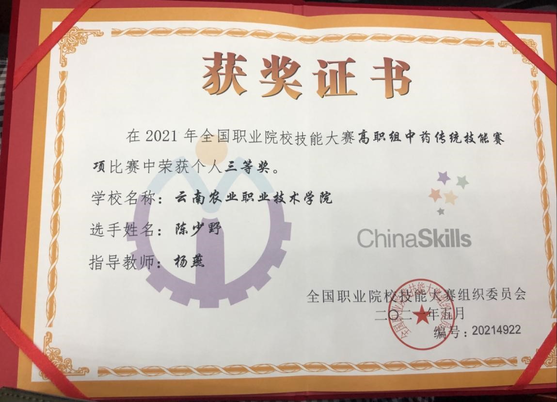 2021年全国高职院校技能大赛高职组“中药传统技能”赛项于202162225日在重庆三峡医药高等专科学校隆重开赛,全国29支代表队29名参赛选手齐聚重庆万州。我院食品药品与大健康学院2019级中药学专业陈少野同学代表云南省参赛,在本次大赛中获得三等奖。