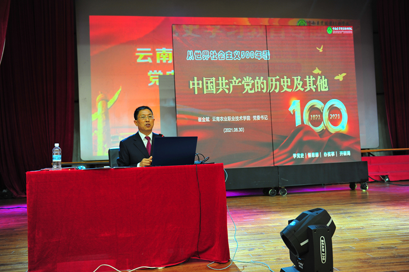 会后,崔金赋书记以《从世界社会主义五百年看中国共产党历史》为题,讲授专题党课。他从原始社会、奴隶社会、封建社会、资本主义社会、社会主义五个社会形态分析了私有制阶级、国家以及政党的起源,从思想源头和实践历程上对世界社会主义五百年以及中国共产党历史等进行了深入浅出地解读。生动的阐释了没有中国共产党,就没有新中国,就没有中华民族伟大复兴。历史和人民选择了中国共产党。中国共产党领导是中国特色社会主义最本质的特征,是中国特色社会主义制度的最大优势,是党和国家的根本所在、命脉所在,是全国各族人民的利益所系、命运所系。
