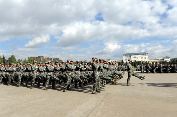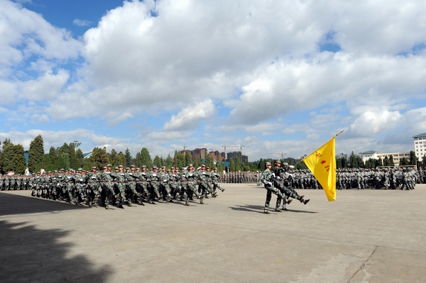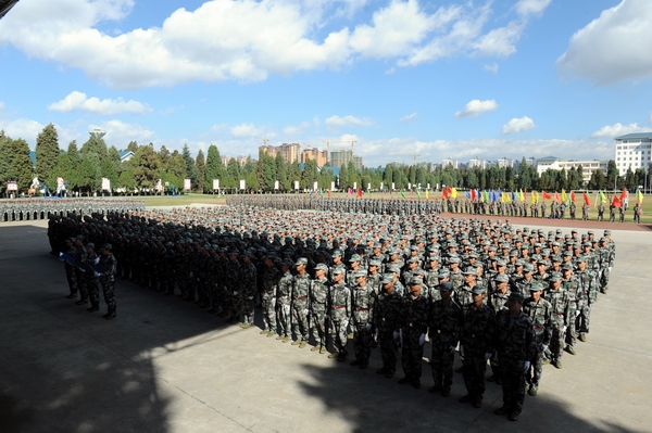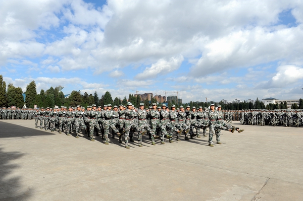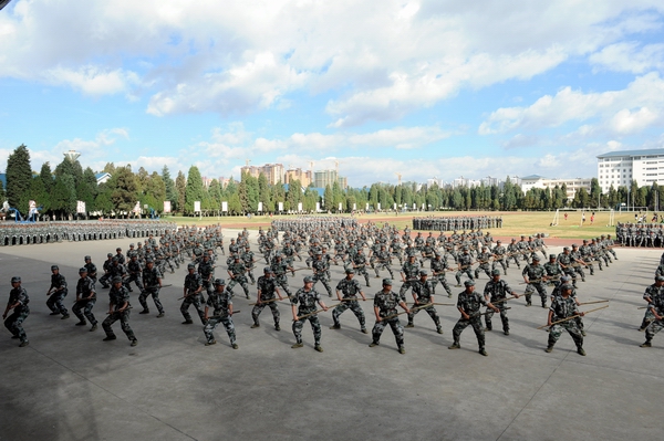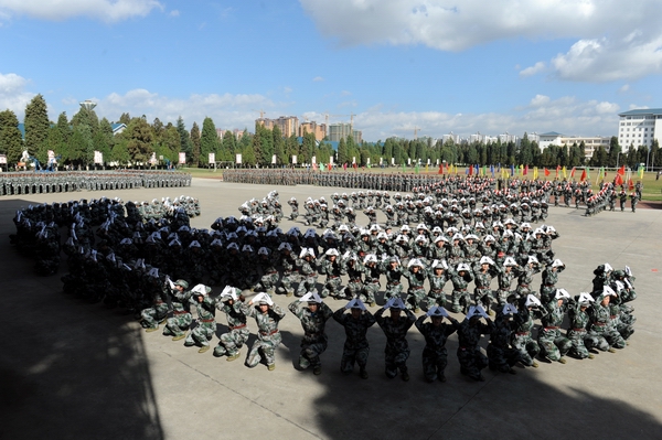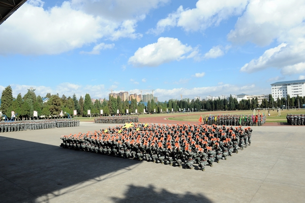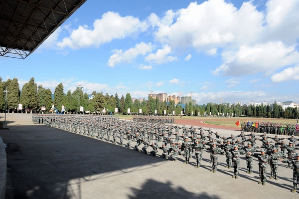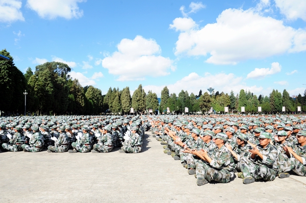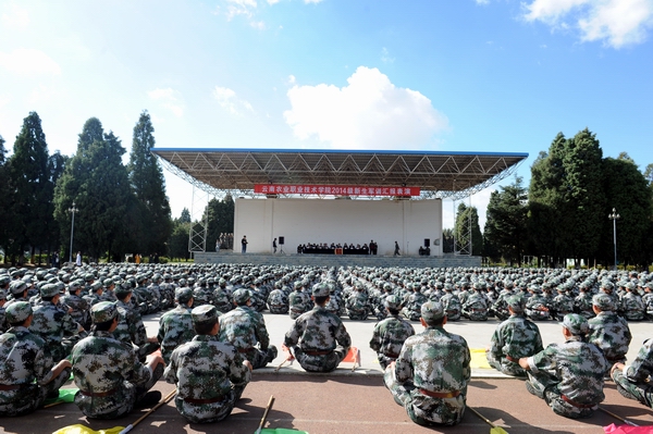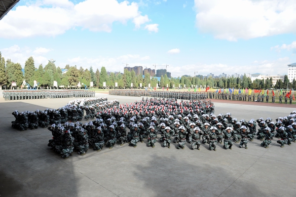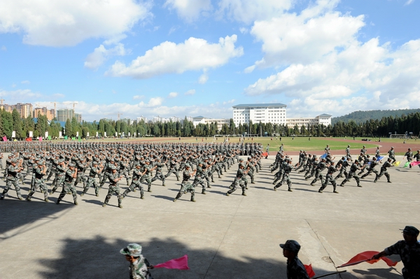 伴着深秋的落叶彩旗飘飘,随着铿锵的锣鼓胸怀激荡。洪亮的口号响彻云天,踏着有力步伐的队伍迎面而来。2013年11月9日上午10:00,beat365官网2014级新生军训汇报表演暨总结表彰大会在昆明民族干部学院检阅台隆重举行。