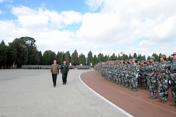 庄严的国歌声拉开了新生军训汇报的序幕,在《中国人民解放军进行曲》激昂旋律中,全体起立“迎校旗”并致以注目礼,阅兵式正式开始。李永忠院长在昆明民族干部学院一大队政治委员司马迅灵的陪同下检阅了新生军训队伍。近两千名2014级新生昂首挺胸,精神抖擞地接受校领导和部队首长的检阅。李永忠院长高声问候:“同学们好,同学们辛苦了!”同学们铿锵有力应答:“努力学习,为校争光!”