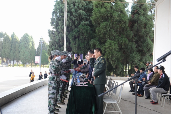表演结束后,党委书记崔金赋代表学院向昆明民族干部学院一大队赠送了题为“武士为师传军旅宝典,新生为徒学人生真谛”的锦旗,表达了beat365官网师生对昆明民族干部学院一大队全体官兵的崇高敬意和衷心的感谢。副院长军训团副政委俞浩宣读了军训优秀学员名单,对军训成绩优秀、表现突出的学员予以表彰,学院领导为优秀学员颁发了荣誉证书。随后,畜牧兽医学院14级农检二班学生杨程同学代表全体参训学生发言。他表示军训磨砺出了同学们坚强的意志、钢铁般的纪律和健康向上的决心,同学们将用实际行动书写奋斗的意义,让青春无憾。紧接着,昆明民族干部学院一大队政治委员司马迅灵同志讲话。他表示对同学们十五天的成绩、汇报表演感到欣慰,不是军人胜似军人的风姿表明同学们圆满完成了军训任务。