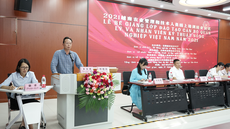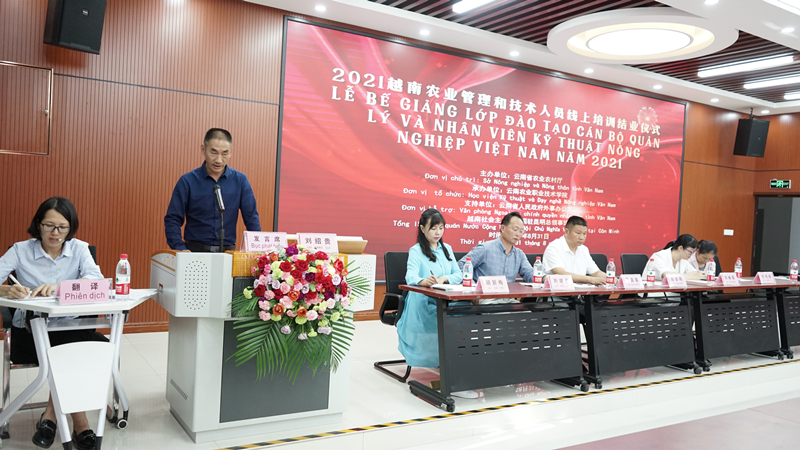 苏华伟副院长代表学院对此次2021越南农业管理和技术人员线上培训进行总结讲话。他代表学院感谢云南省农业农村厅、云南省人民政府外事办公室对学院的关心和帮助,感谢越南驻昆明总领事馆对学院工作的支持。他指出,此次培训具有上级高度重视、学习氛围浓厚、培训形式新颖、内容丰富等鲜明特点,为学员带来了先进的发展理念和经验,提出了可借鉴的发展举措和办法,对提高学员能力和水平、提高越南农业种养殖水平,促进农业产业发展具有很好的指导意义。