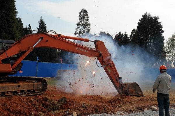在党委书记崔金赋宣布“项目正式开工”!在热烈响亮的炮竹声中,挖掘机挖下了工程项目的第一铲土。(党委宣传部供稿)