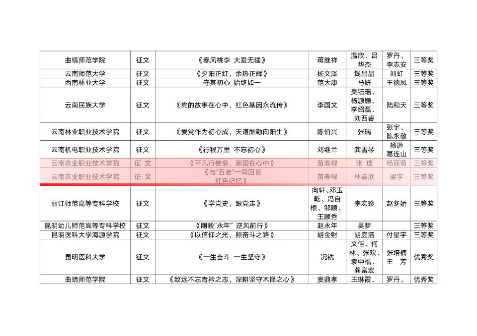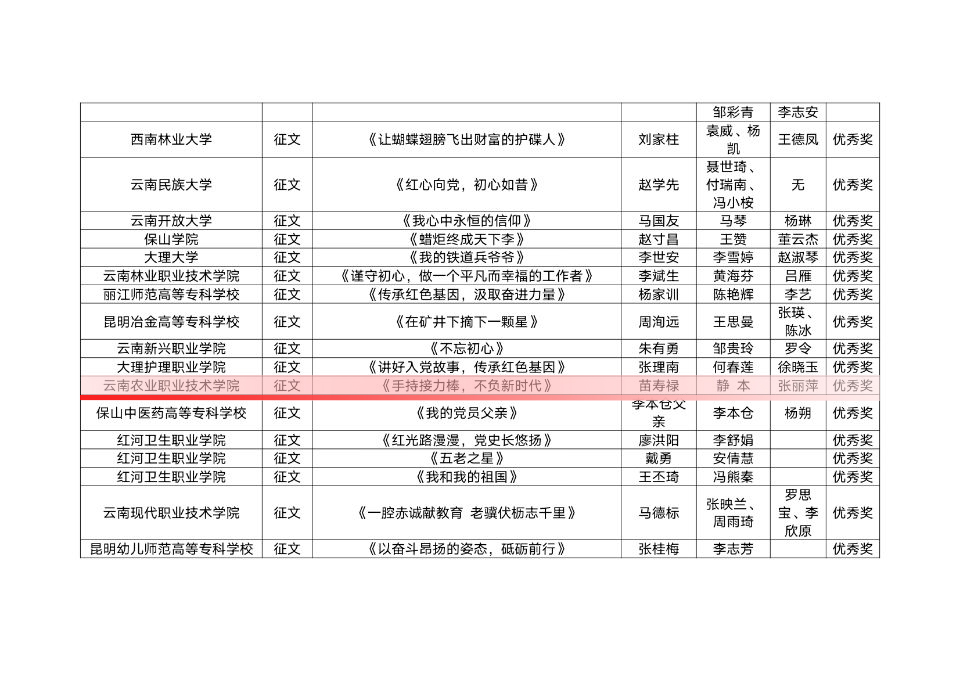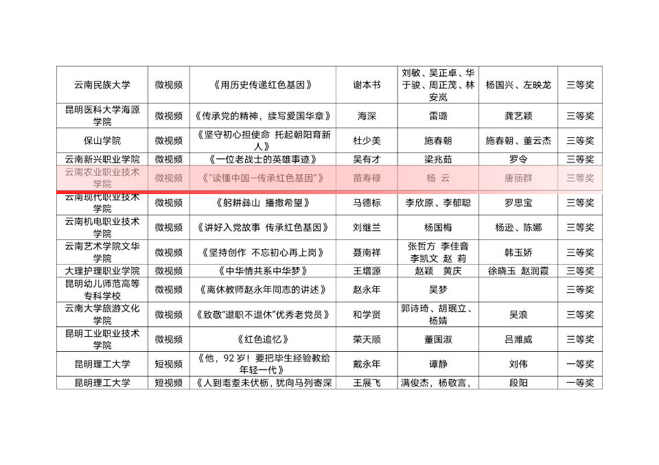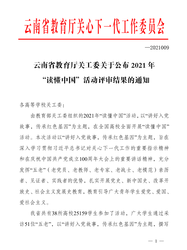 近日,云南省教育厅关工委公布了2021年“读懂中国”活动评审结果。我院19园艺技术一班杨云微视频作品《“读懂中国—传承红色基因”》荣获三等奖,19园林技术一班张璟征文作品《平凡行使命,家国在心中》、20畜牧兽医五班林睿欣征文作品《与“五老”一同回首红色记忆》分别荣获三等奖,19财务管理六班静本征文作品《手持接力棒,不负新时代》荣获优秀奖。