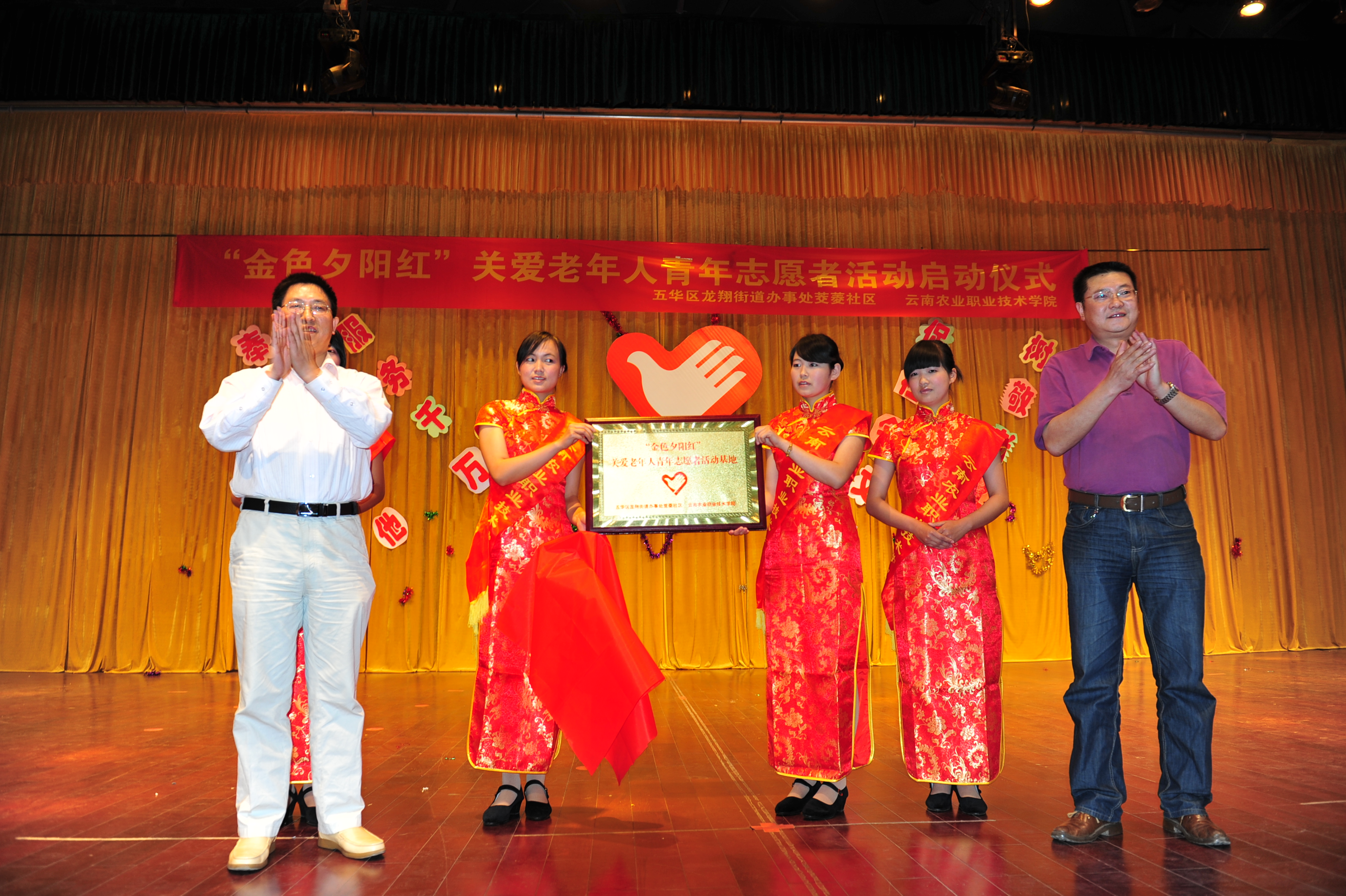 为进一步加强与所在社区的合作,五华区龙翔街道办事处在我院建立“金色夕阳红”关爱老年人青年志愿者活动基地。崔金赋书记和陈永谦书记在关爱老年人青年志愿者活动启动仪式上为基地揭牌。