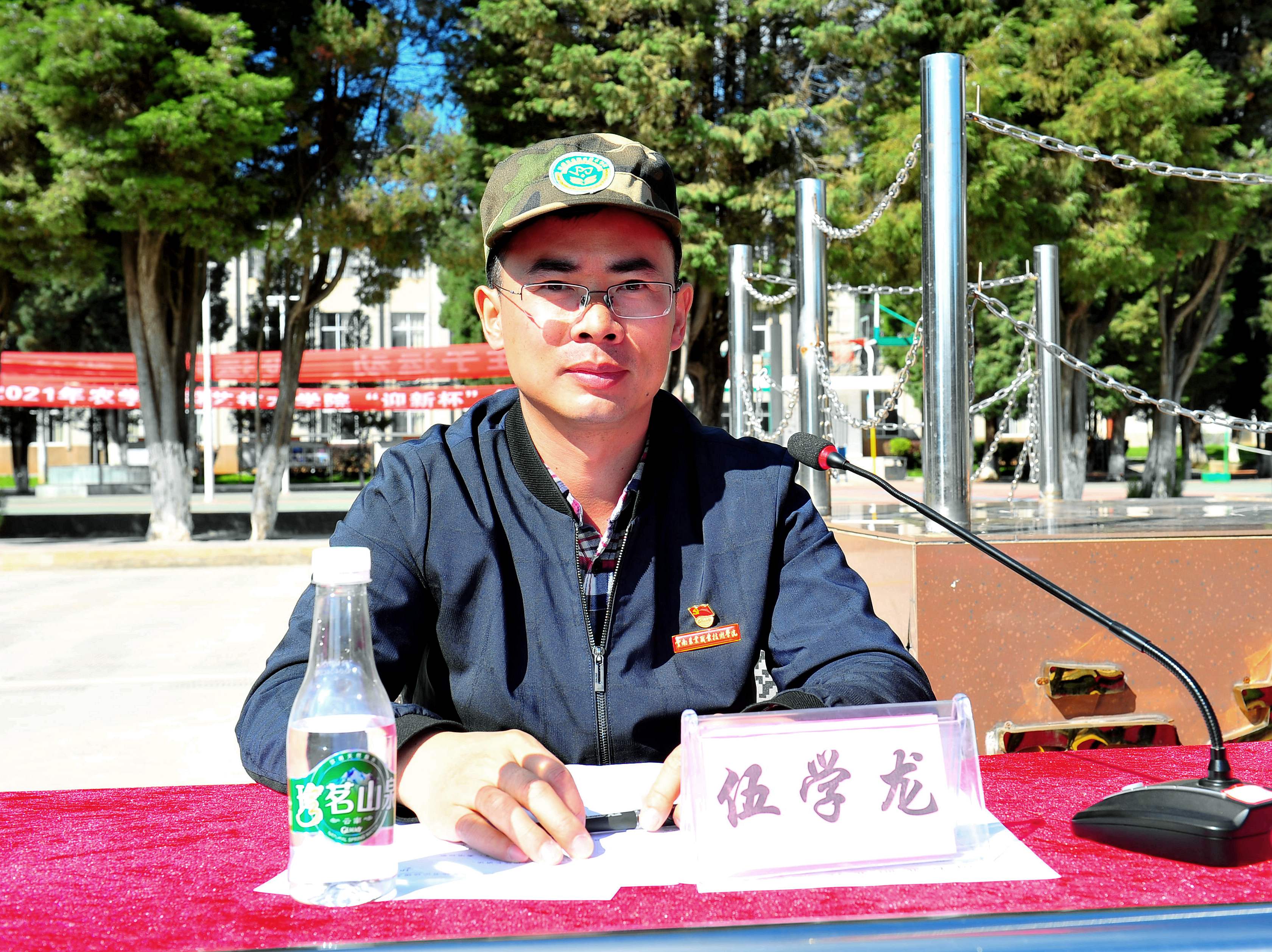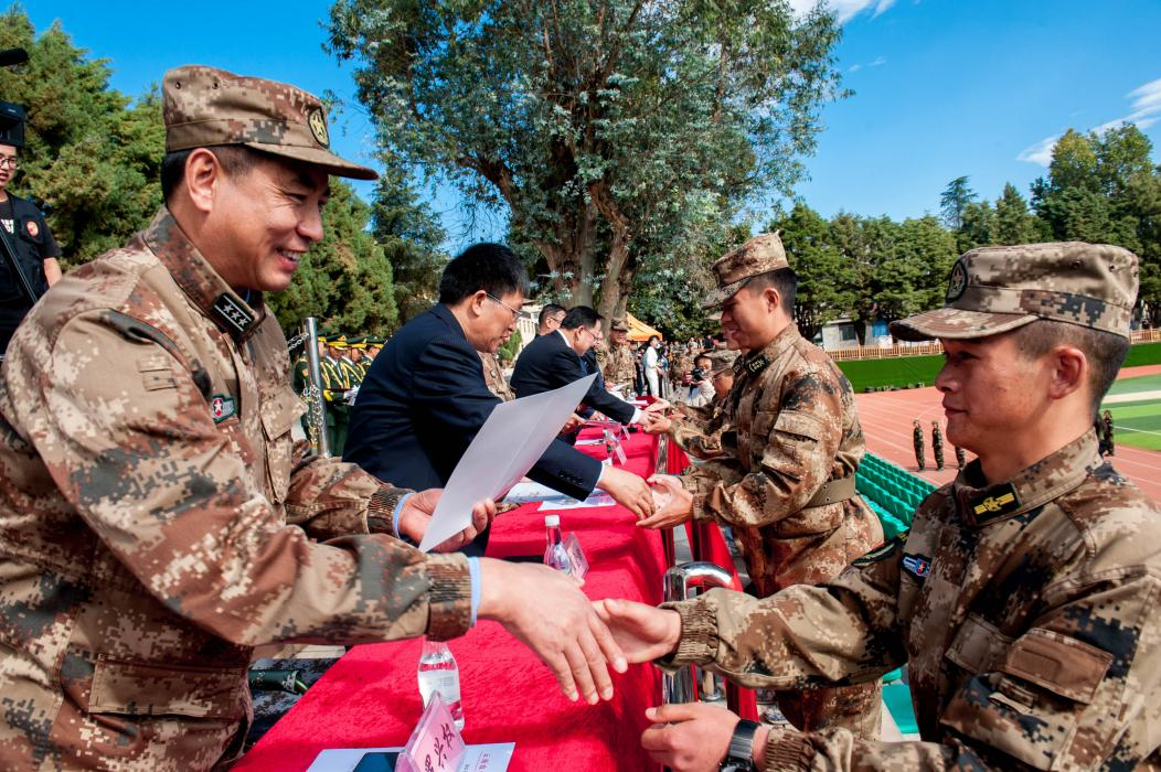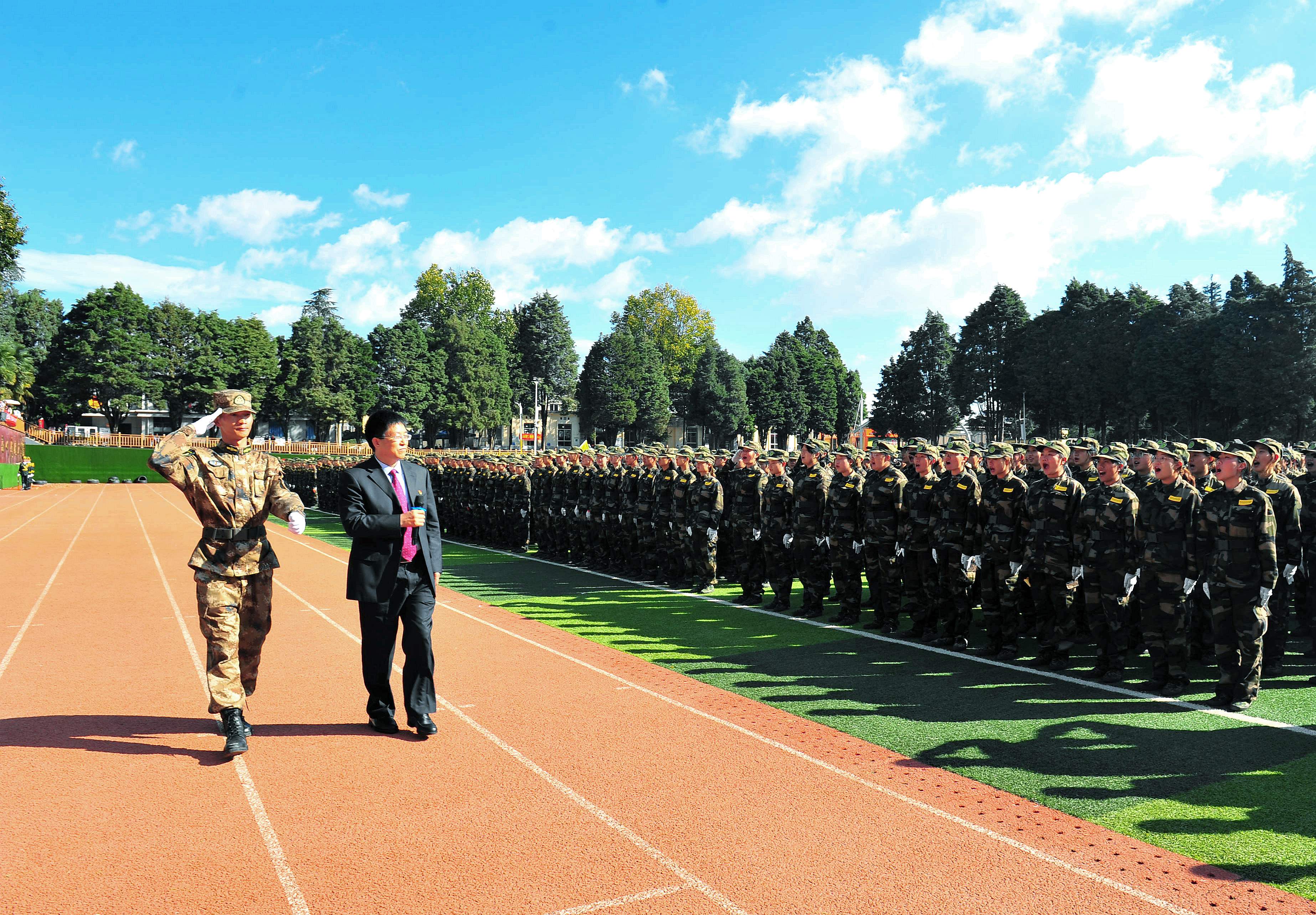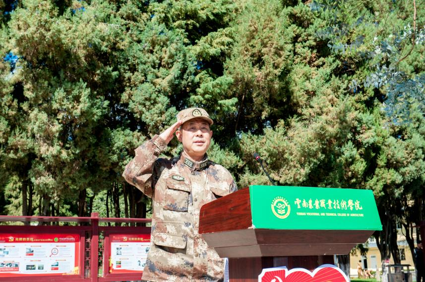 11月4日上午,学院2021级学生军训结业典礼暨表彰大会在小哨校区田径场举行。昆明兵站杨锡光上校、学院党政领导、宣传部、学生处(武装部)、教务处等职能部门负责人、各二级学院副科级以上领导干部,全体新生班主任、驻训工作人员等参加大会。大会由党委副书记伍学龙主持。