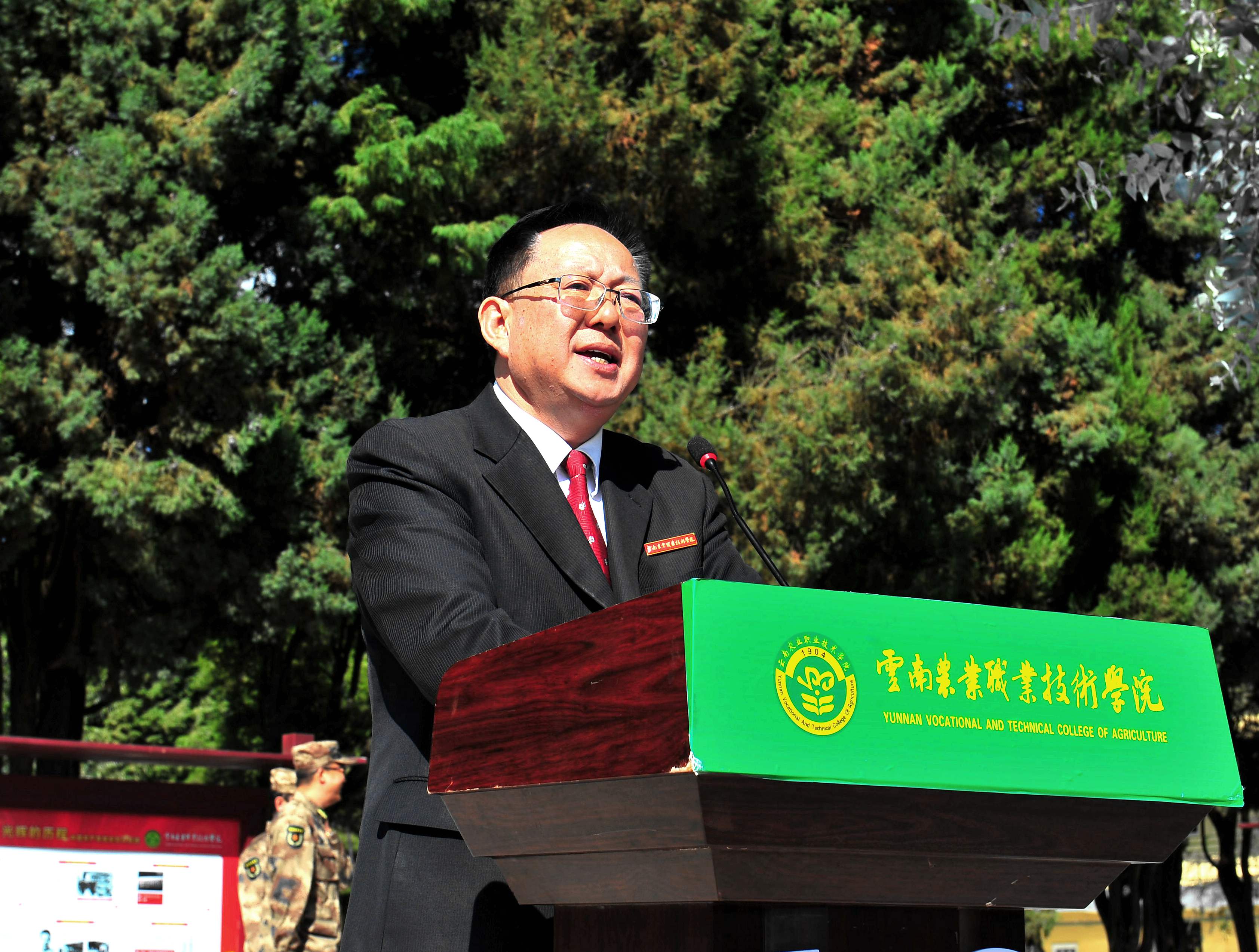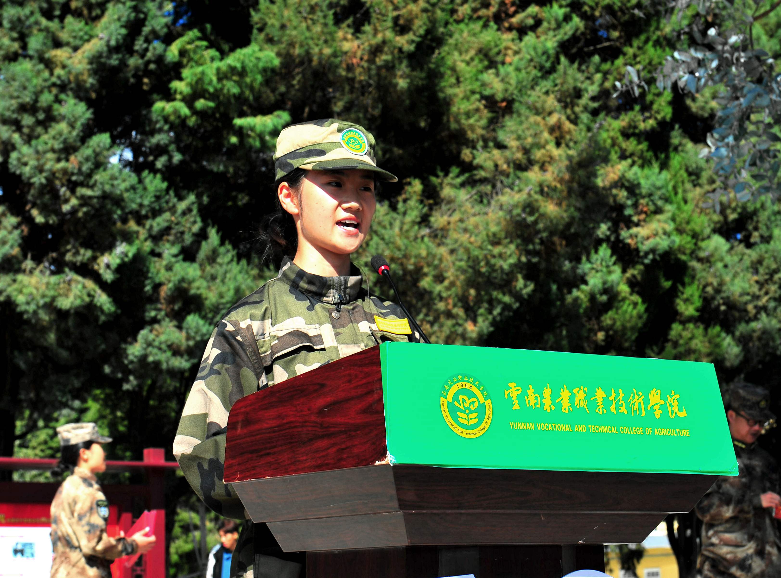 昆明兵站学生军训基地领导杨锡光上校讲话,杨上校祝贺同学们圆满完成训练任务,对同学们的军训成果给予肯定,并希望同学们今后做一名有益于班级、学校和社会的有用之人。