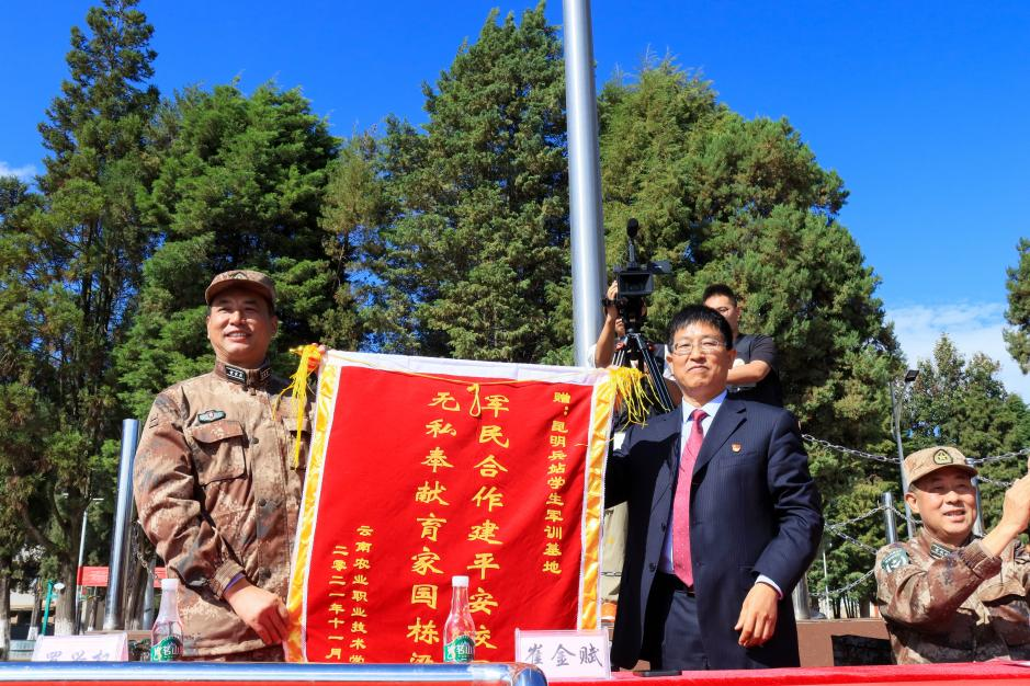 军事训练圆满完成离不开军训基地的全力保障支持,党委书记崔金赋向昆明兵站学生军训基地赠送锦旗。