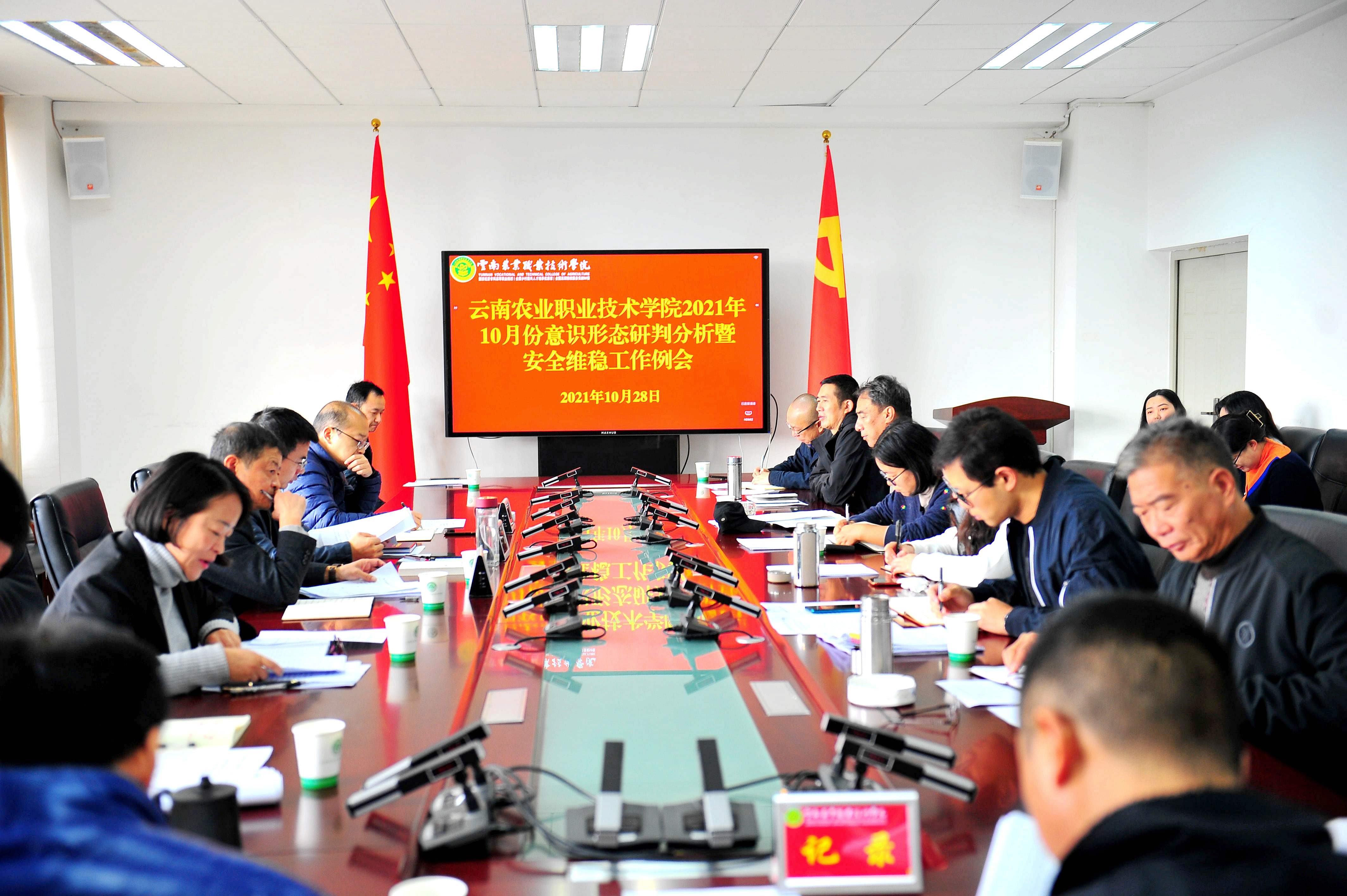 会议由伍学龙副书记就近期意识形态和安全维稳工作提出要求。他强调,随着学生群体层次变化及社会环境的影响,意识形态安全风险和安全维稳工作难度加大,对下一步开展工作提出了新挑战和更高要求。主要抓好以下七个方面的工作:一是加强对《云南农业职业学院突发事件应急预案(试行)》的学习,让各类突发事件应急处置有章可循,报告、前期处置等程序更加规范;二是注重顶层设计,加强辅导员队伍建设、发挥辅导员优势,把工作做实做细,发现在前端落实在末端。三是重视制度建设。通过多渠道多方法多形式,进一步制定行之有效全面多元的规范制度,成熟一个、讨论一个、推出一个、落实一个;四是注重系统联动的紧密性,形成合力,各部门和二级学院要把管理重心下沉到宿舍,提高处置突发事件的预见性、有效性和全面性;五是功夫下在平时,用心关爱学生。要积极动员学生购买人身意外伤害险,特别是在外实习学生,增强安全保障屏障,防患于未然;六是及时收集掌握师生的思想动态和趋向,充分汲取反面案例的教训,及时发现、分析、解决问题;七是树立有效预防为先观念,狠抓具体工作落实为本,提高效率,真正达到安全维稳例会的目的。