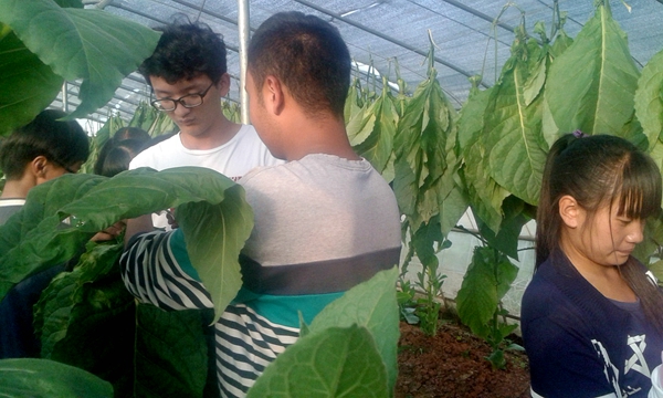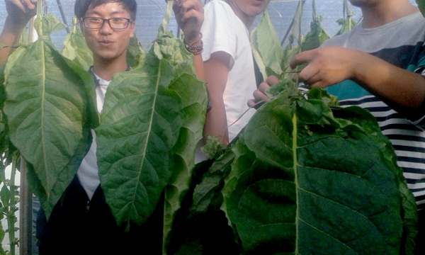 9月10教师节当天,解芬老师带领14烟草和15烟草专业的学生们在小哨农场采收和晾晒雪茄烟。2015年初解芬老师申请到学院的一般项目,带领15专业的学生,从一颗种子开始种植和研究雪茄烟外包皮,目前采收到的雪茄烟叶片大而薄,结构组织疏松,支脉细,从原叶外观上看基本属于优质雪茄烟外包皮。