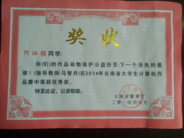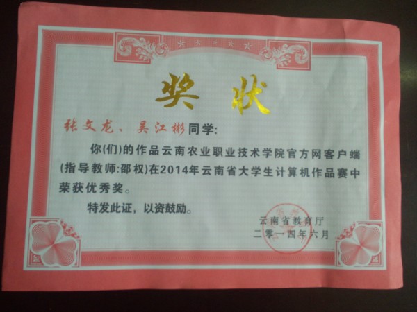 2014年6月7日,由云南省教育厅主办,云南省计算机科学与技术专业教学指导委员会、云南省计算机学会、昆明学院承办的“2014年云南省大学生计算机作品赛”在昆明学院举行。此次参赛学校共有31所,参赛作品达六十余件,云南大学、云南理工大学等我省名校均上报了多件参赛作品。beat365官网经济管理学院组队首次参加我省计算机大赛,通过精心准备,学院选送了《动物保护公益折页:下一个消失的是谁?》及《beat365在线唯一官网官方网客户端》2件作品进行比赛,两项均获得了优秀奖。