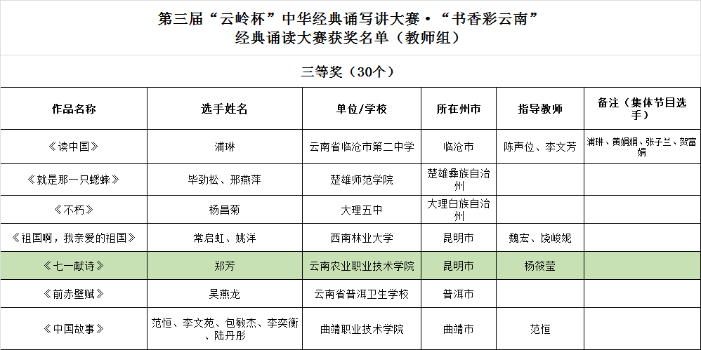 农学与园艺技术学院顾李通的作品《少年中国说》,畜牧兽医学院龙云、伍兆琪和食品药品与大健康学院高俊峰的作品《秋瑾》获经典诵读大赛大学生组三等奖。
